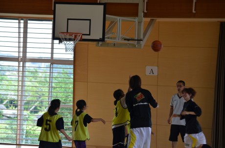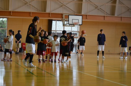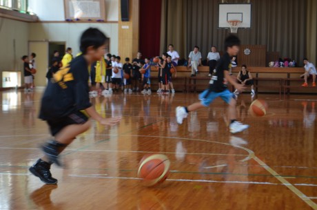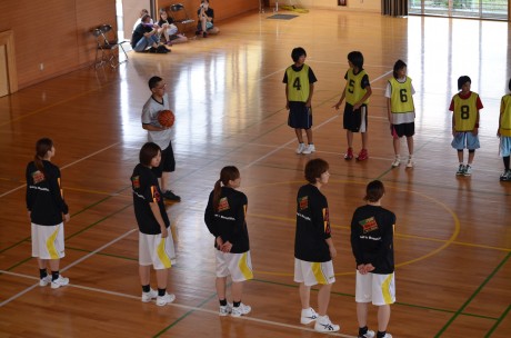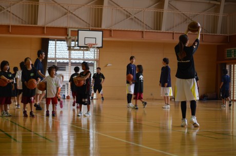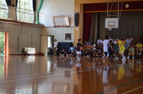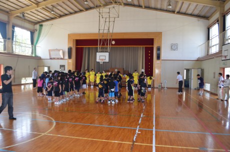 午前中は甲州市の小学校で男女約50名の皆さんと基礎練習、ゲームをグループ別に行いました。
