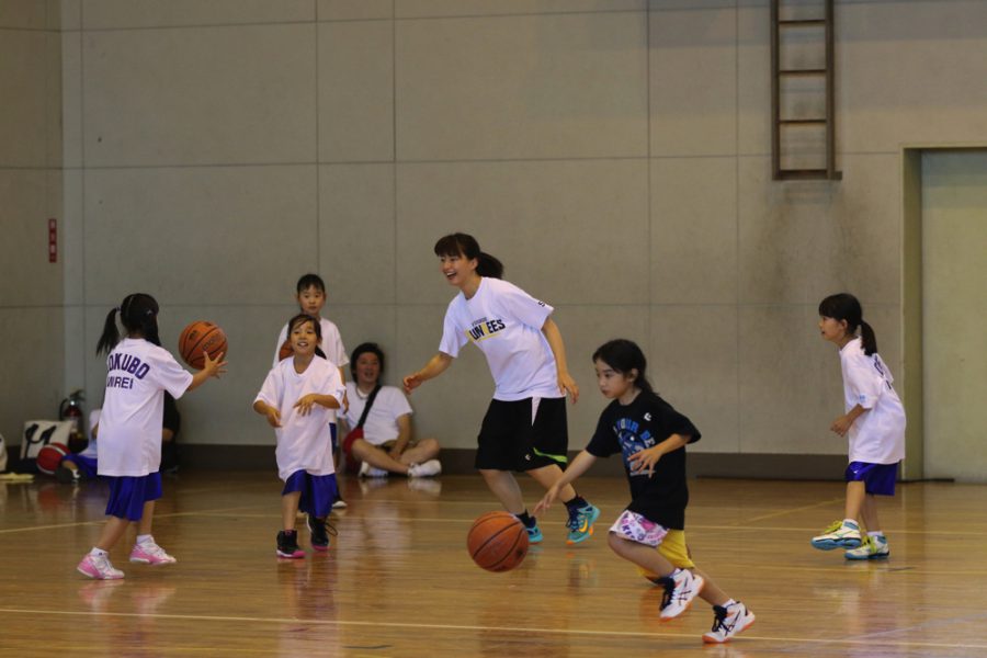 6月17日(土)甲府市中道スポーツ広場体育館にて市内の小学4年生以下、35名が集まるクリニックにコン(近内 瞳)、レオ(外山 紅音)、セア(関 彩未)、レン(水野 菜穂)