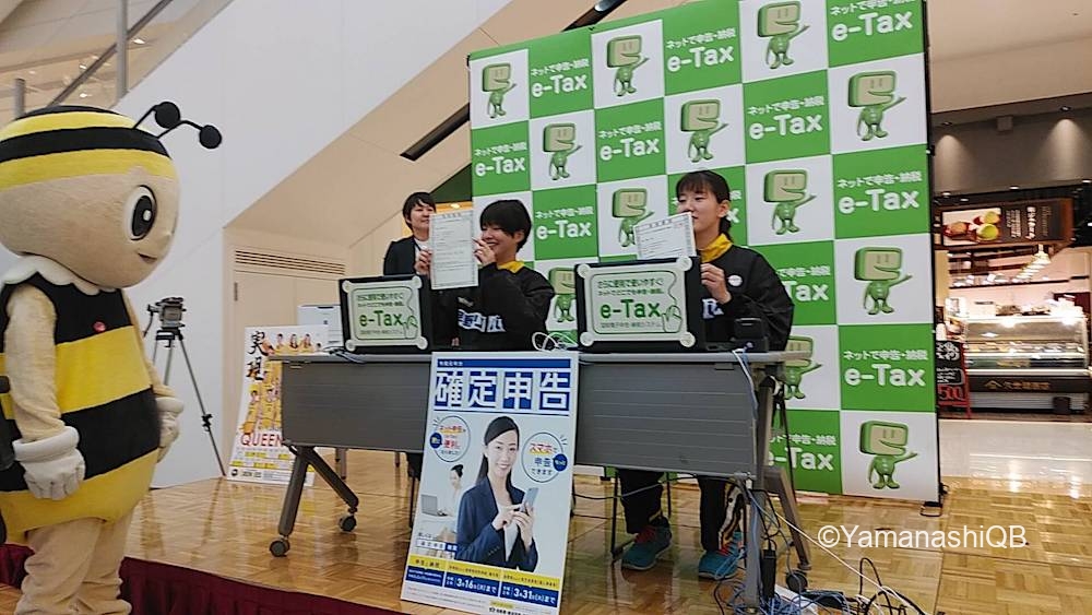 昨日(2月5日)イオンモール甲府昭和で岡萌乃と水野菜穂が2月17日から受付が始まる確定申告を電子申請で行うために必要なID・パスワードの取得体験を行い、自宅でも申告が行える電子申請の便利さをPRしました。