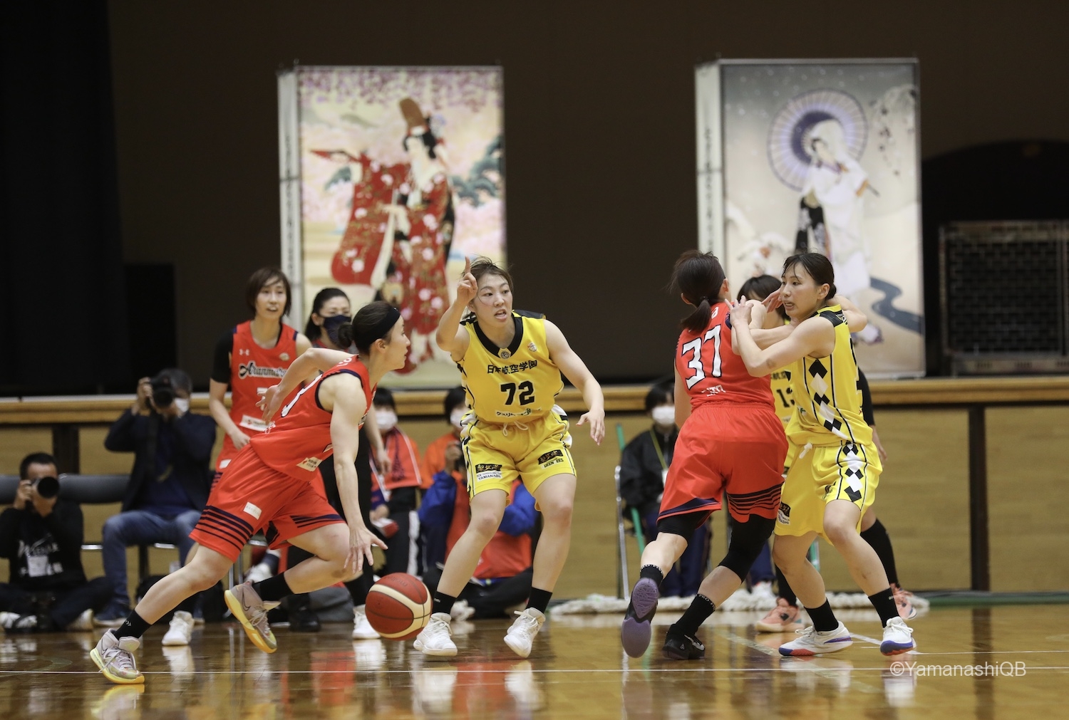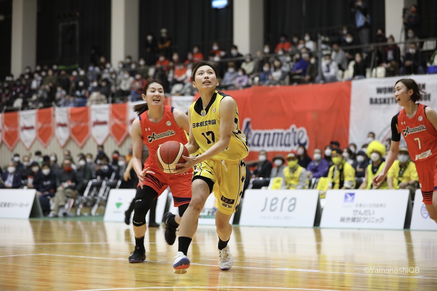 前半のクィービーズは片山5点、出原9点、途中出場の中山が6点と若手が躍動、前半を32対30と2点リードで折り返す。しかし後半、アランマーレのゾーンプレスに手を焼く場面も見られて遂に逆転を許す。