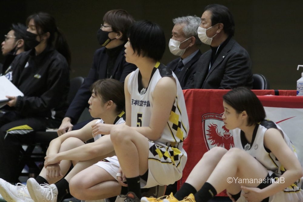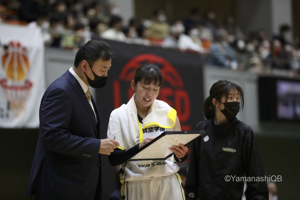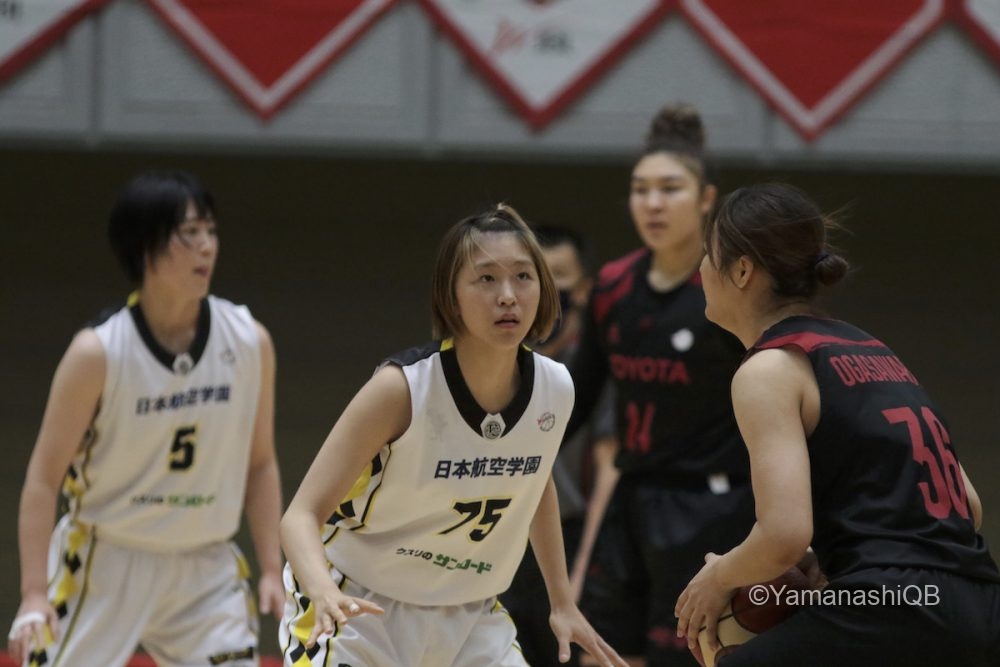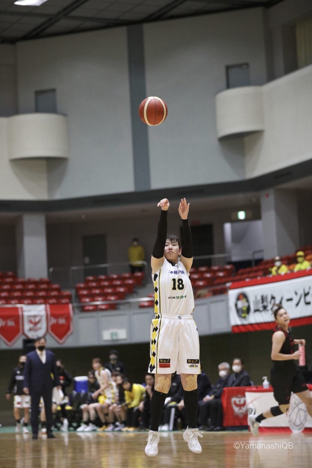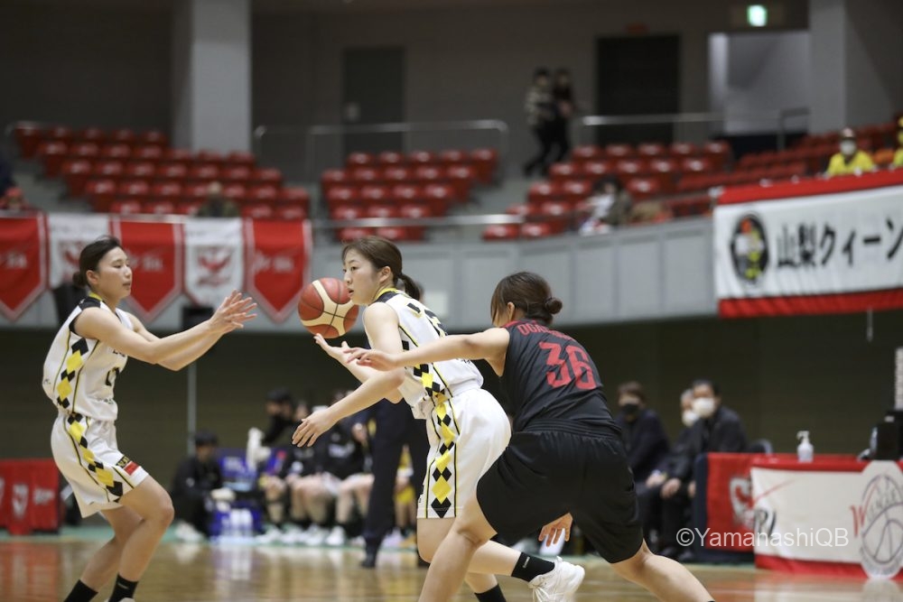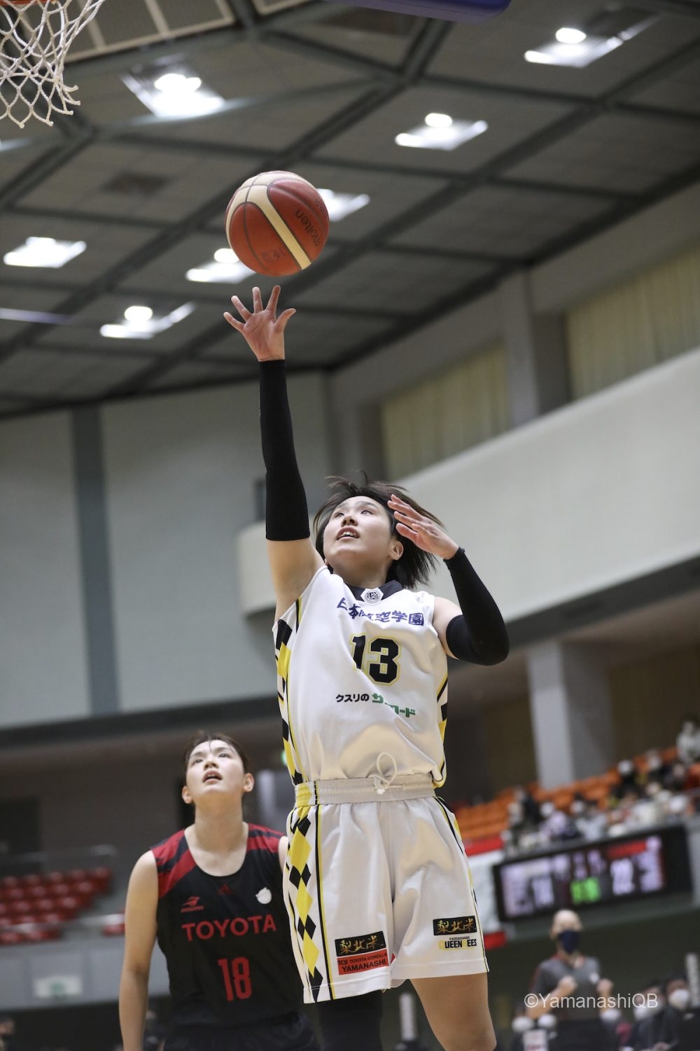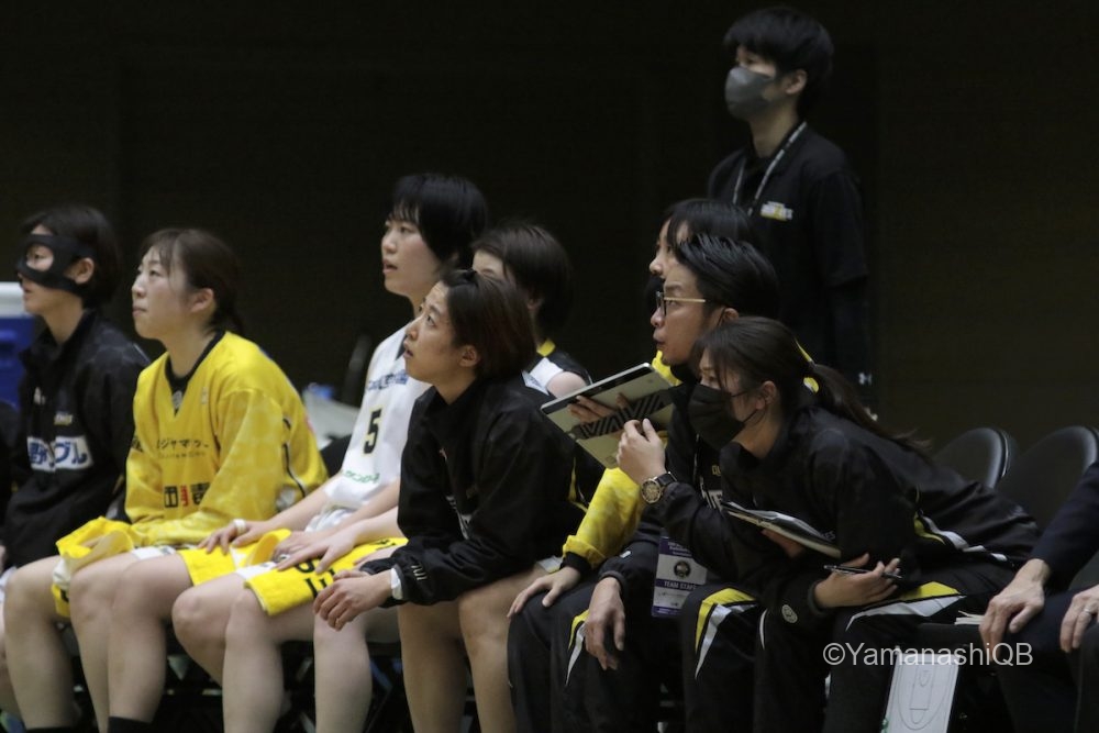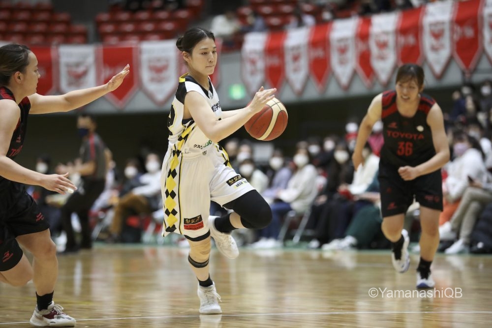 2ピリもスリーが好調で、岡・濱西 七海の得点で一時は21-24とトヨタ自動車に迫るクィーンビーズは、その後も食い下がるが、2ピリ残り4分、山梨のタイムアウト明け、トヨタ自動車が2スローのあとに仕掛けたプレスにハマったところから点差は開き、21点差の28-49で前半を終了。