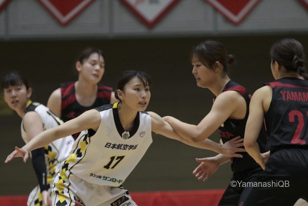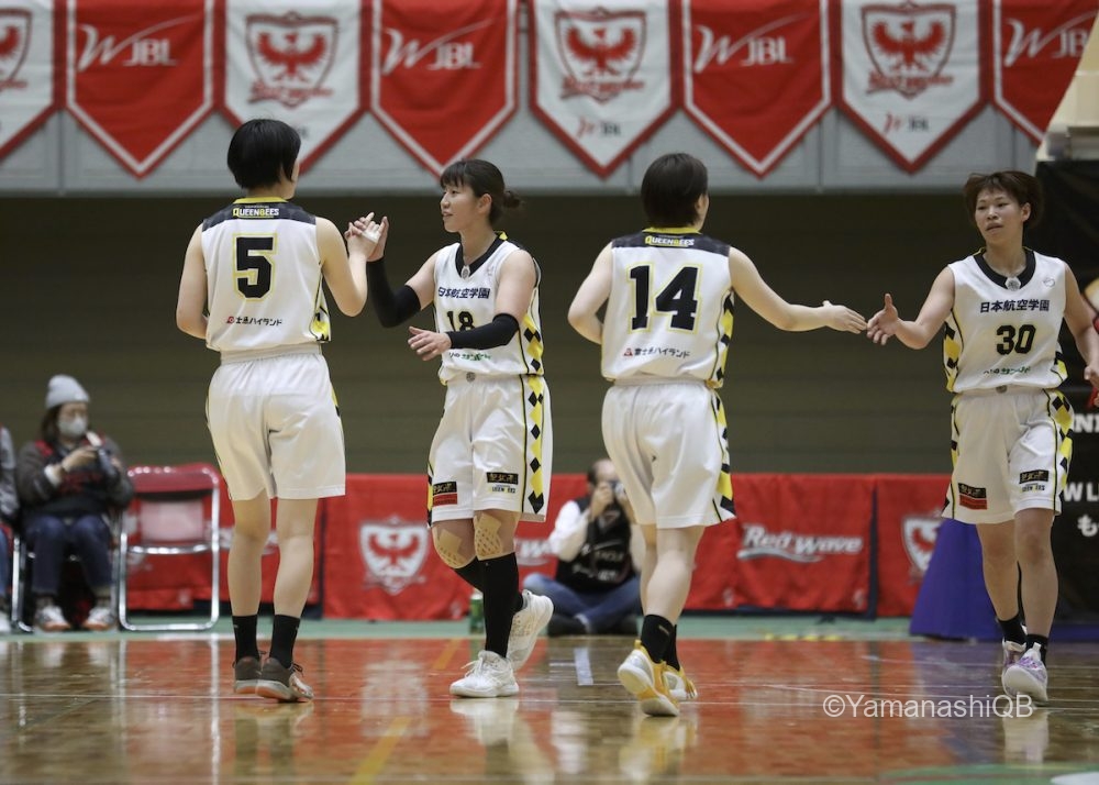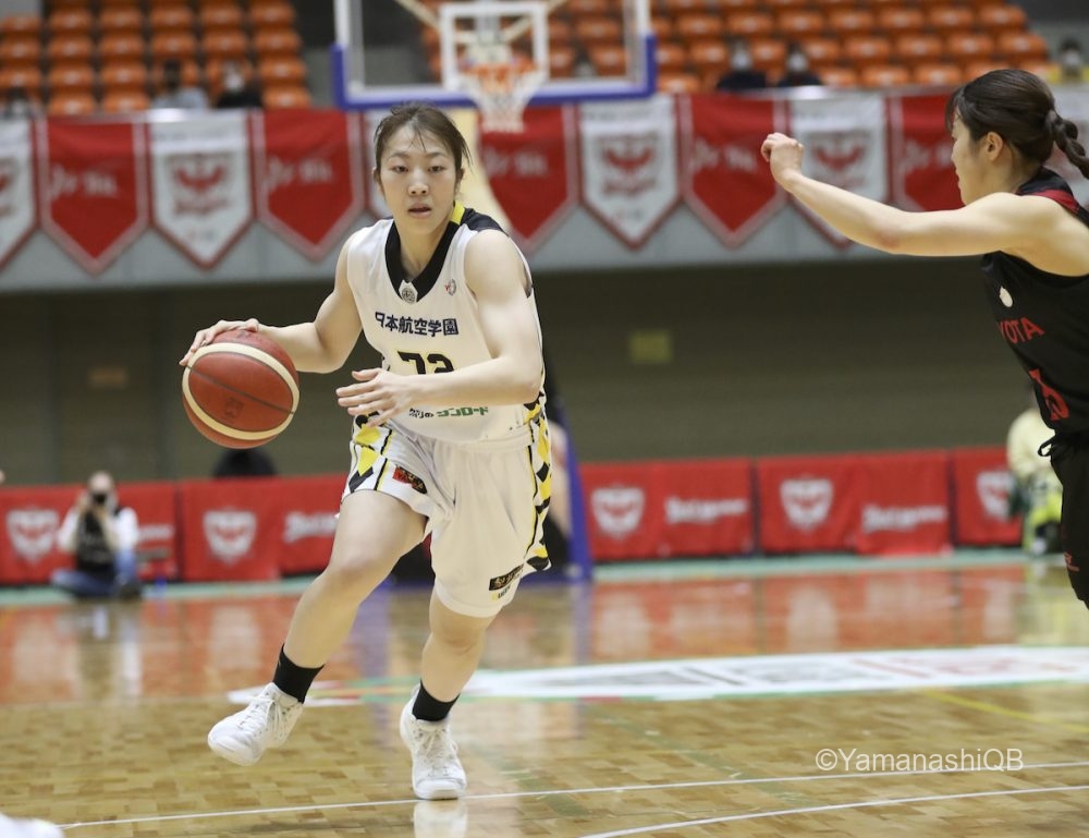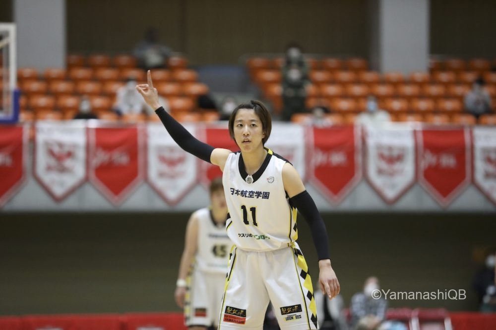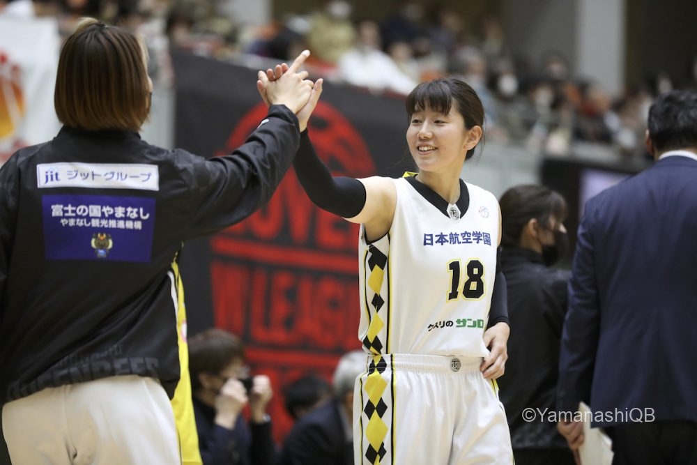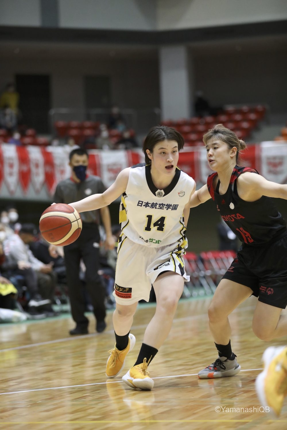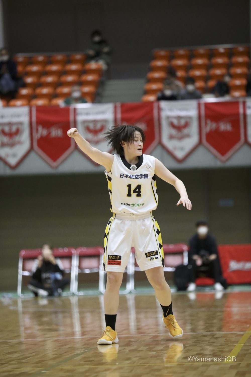 2ピリもスリーが好調で、岡・濱西 七海の得点で一時は21-24とトヨタ自動車に迫るクィーンビーズは、その後も食い下がるが、2ピリ残り4分、山梨のタイムアウト明け、トヨタ自動車が2スローのあとに仕掛けたプレスにハマったところから点差は開き、21点差の28-49で前半を終了。