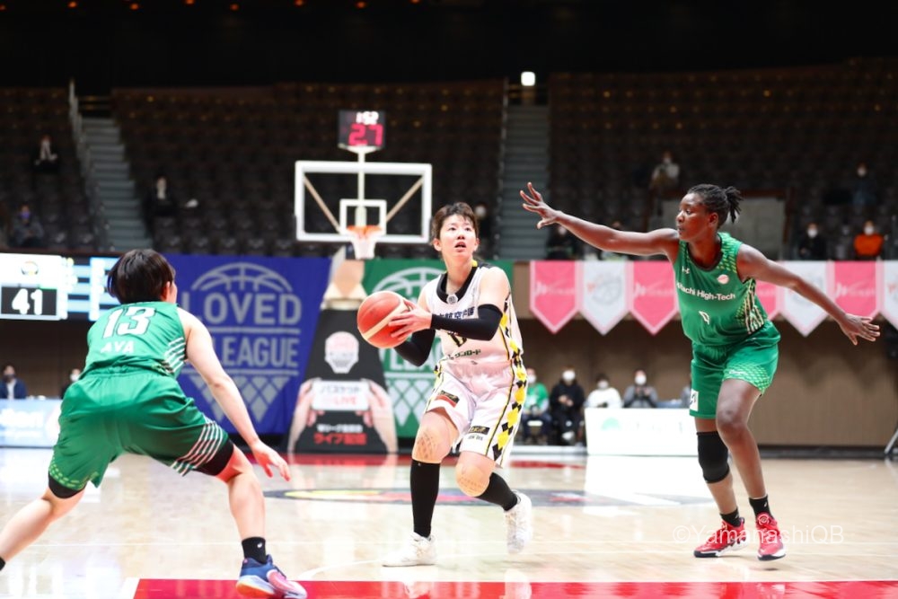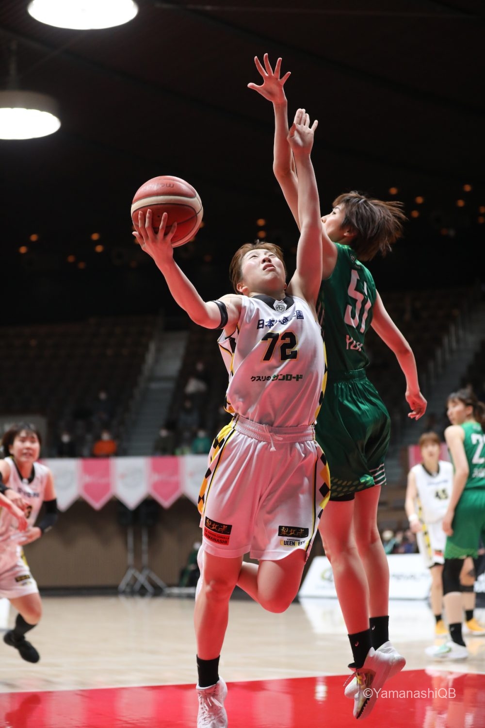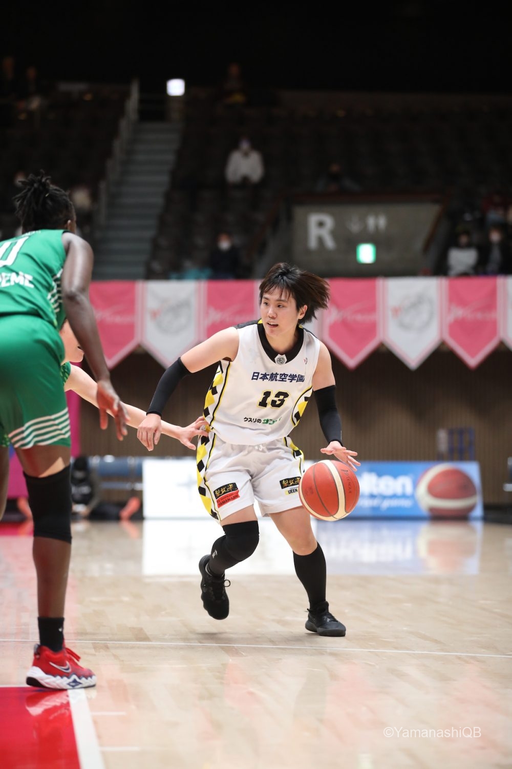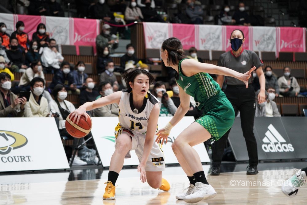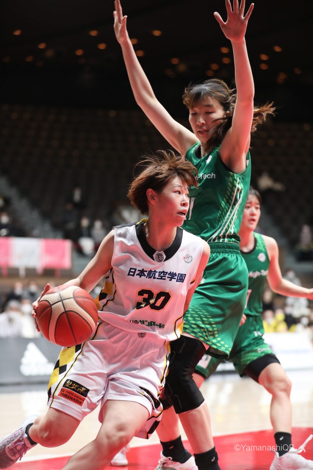 後半に入ると健闘していたオフェンスリバウンドで苦戦する中、日立ハイテクのミスにも救われ、3ピリ残り2分31秒には岡萌乃のスリーで一旦は41-40と逆転するが、そこから再逆転を許し54-58で試合は終了。