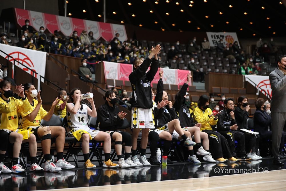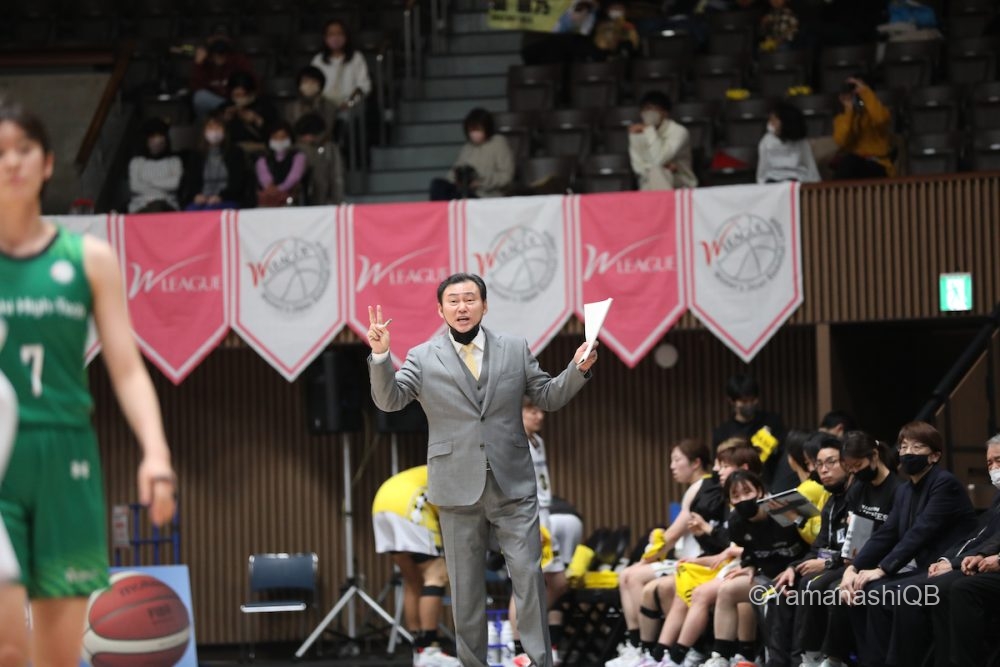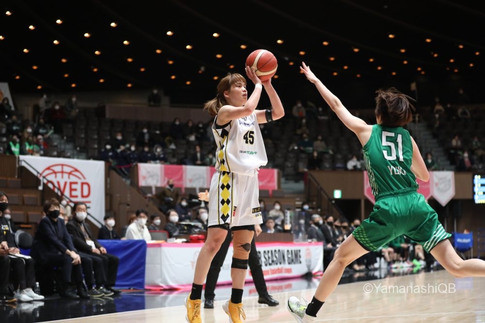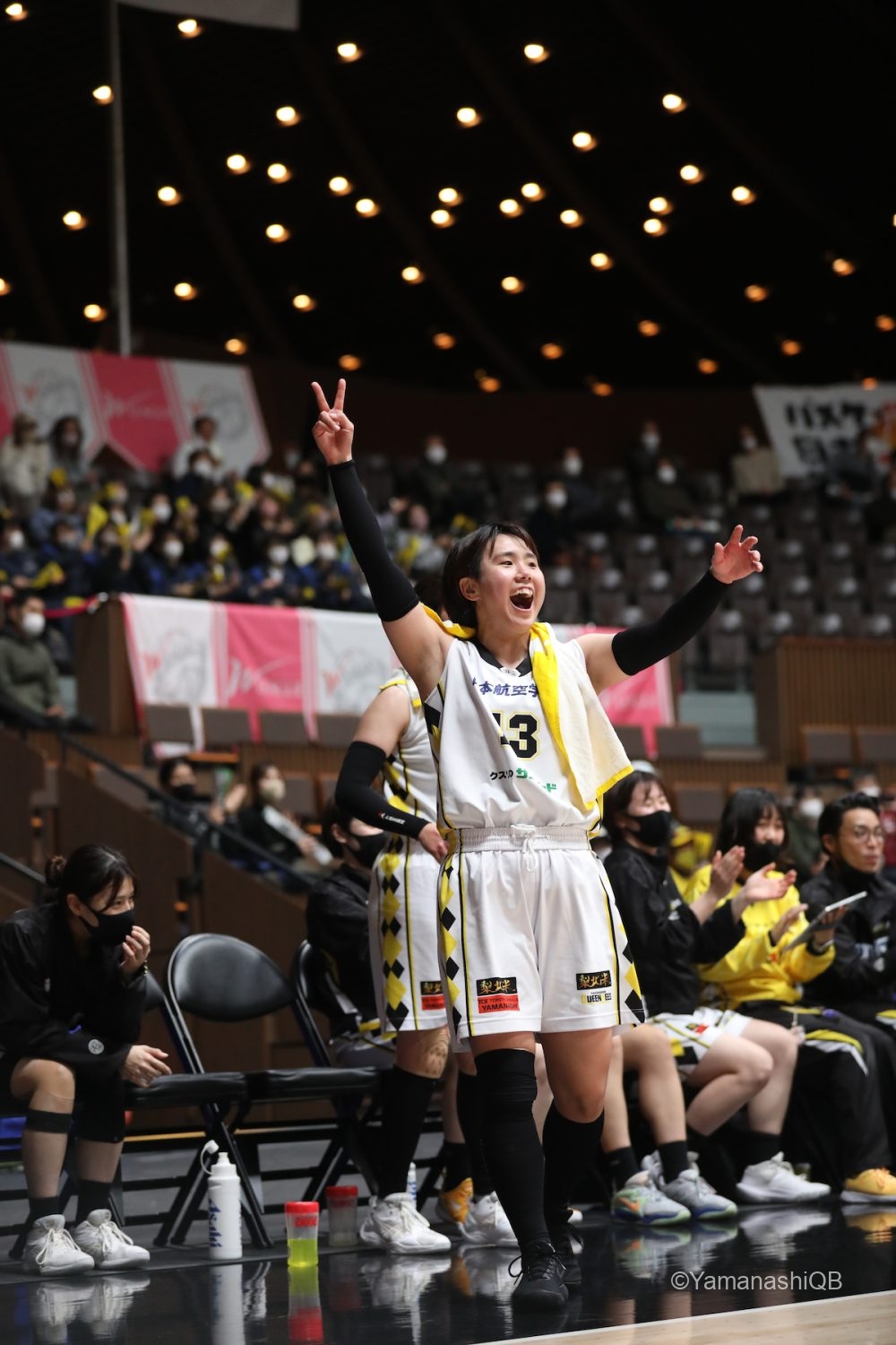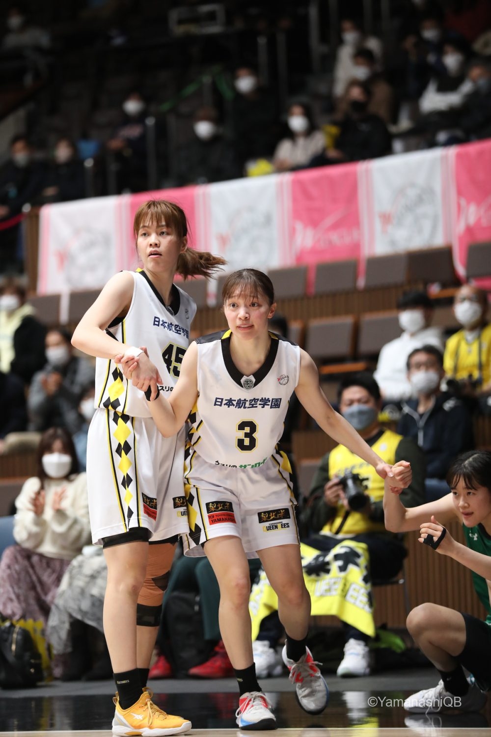 後半に入ると健闘していたオフェンスリバウンドで苦戦する中、日立ハイテクのミスにも救われ、3ピリ残り2分31秒には岡萌乃のスリーで一旦は41-40と逆転するが、そこから再逆転を許し54-58で試合は終了。