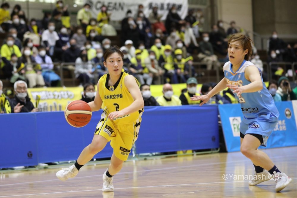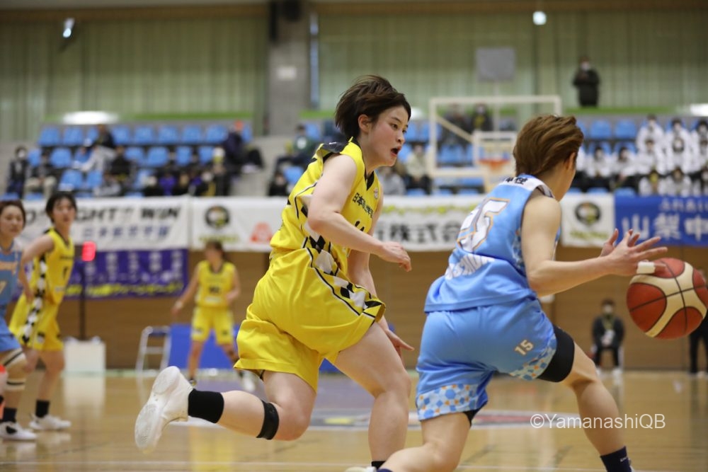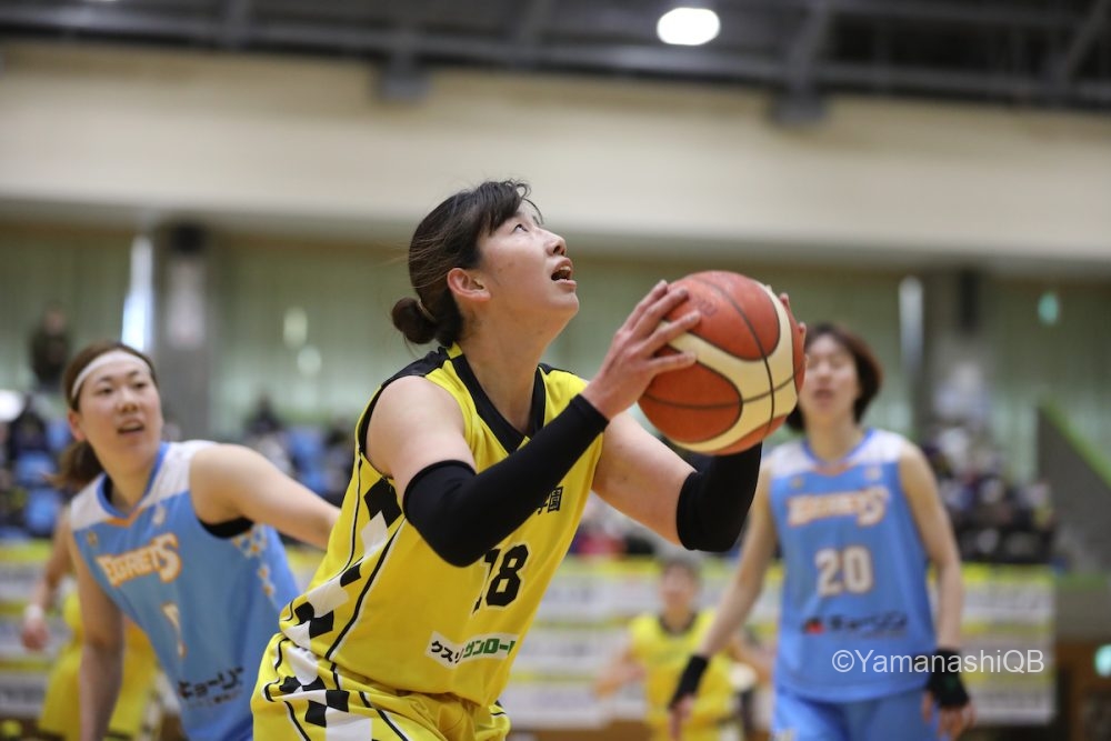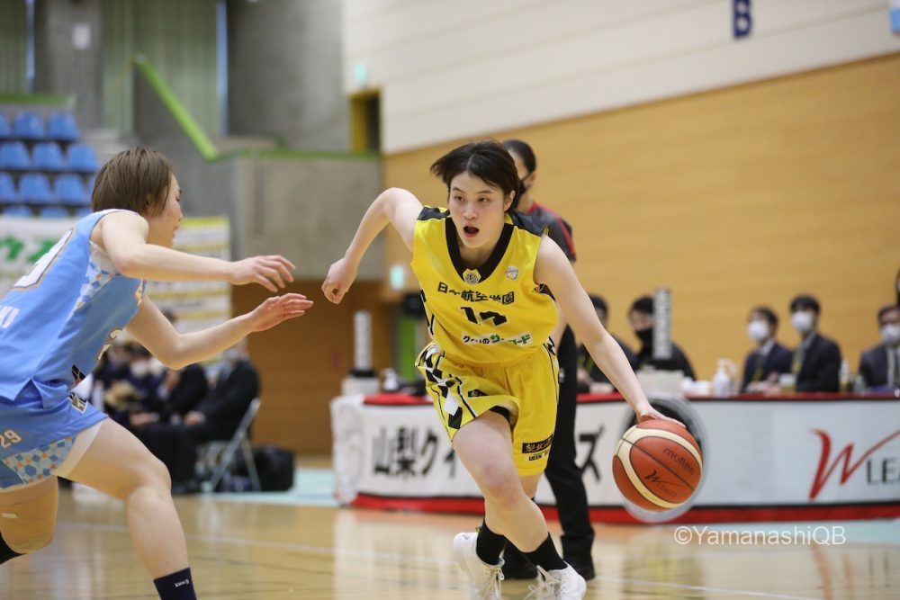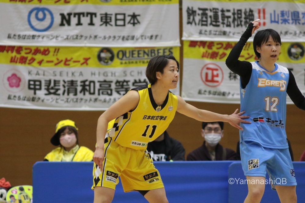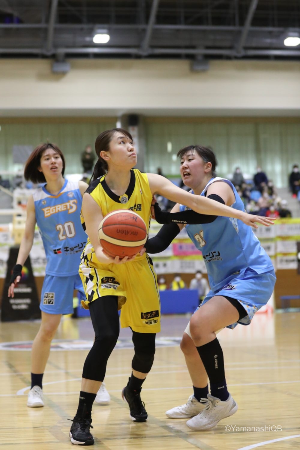ゲーム1とは、全く逆の展開となったクィーンビズは、3ピリに入っても3分以上シュートが決まらずシュートミスを起点に走る姫路が、この日最大17点をリードしたところで、金子寛治ヘッドコーチがタイムを要求。 タイムアウト明けから渡邊愛加が連続得点、プレスに切り替えたディフェンスも機能し得点差を2ピリ終了時点の12点差に戻して、最終第4ピリオドへ。