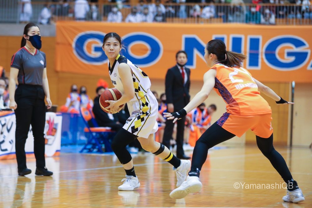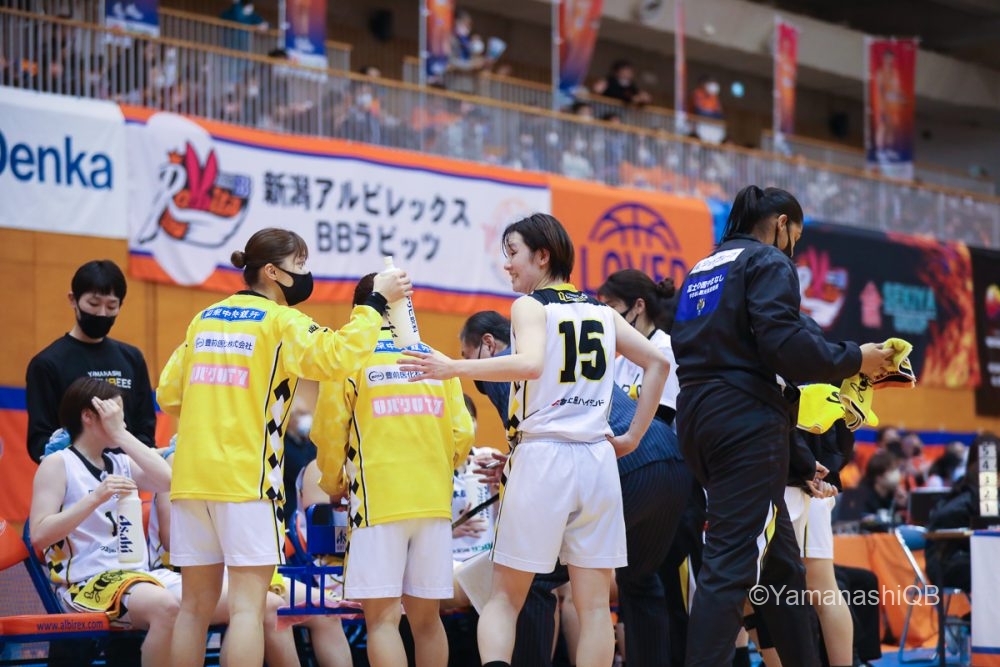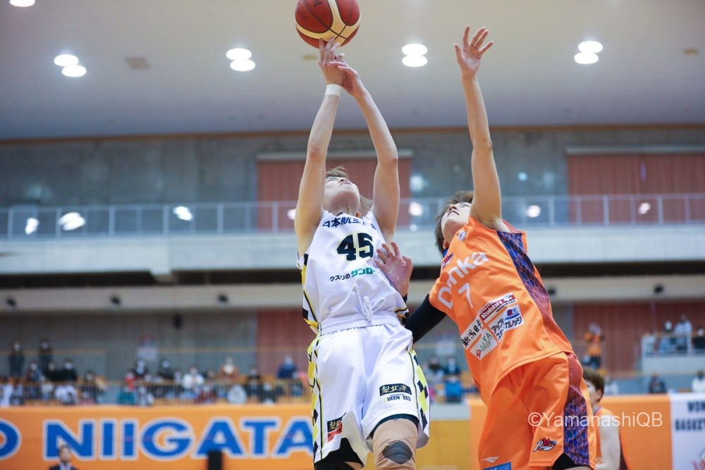 その結果として新潟のディフェンスに生じるズレた隙間から効率よくスリーを沈め、新潟は1ピリで早くも2回のタイムアウトを使って流れを変えようとするが、23-17とクィーンビズが6点リードして第2ピリオドへ。
