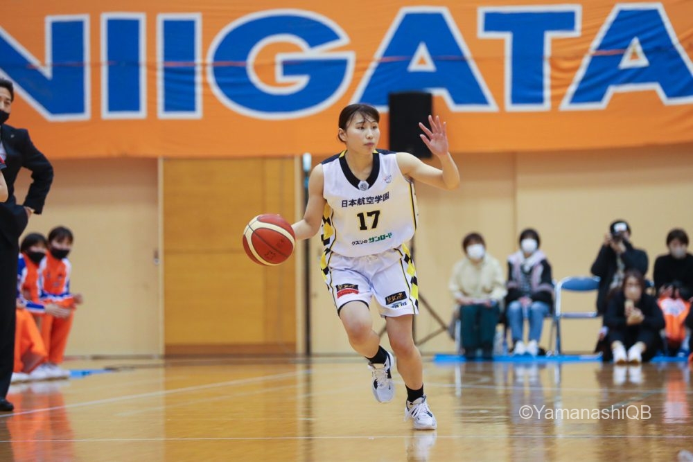 この試合の総括とも言えるよな第4ピリオドは、相手のパスカットからのブレイク、土田・濱西のドライブ、前が開いたら躊躇せずシュートを放つ岡、そしてリバウンドに飛び込む渡邉愛加。試合の主導権を握ると残り2分40秒で新潟はファイブファール。