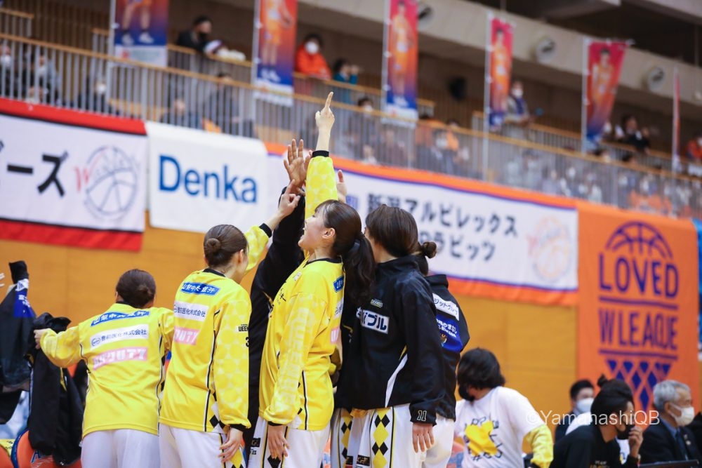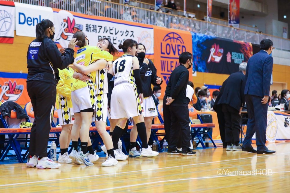 しかし、細かい連携でミスが続きオフェンスがまた停滞すると、攻撃のテンポが上がる新潟に残り2分で54-53と1点差に迫られる。