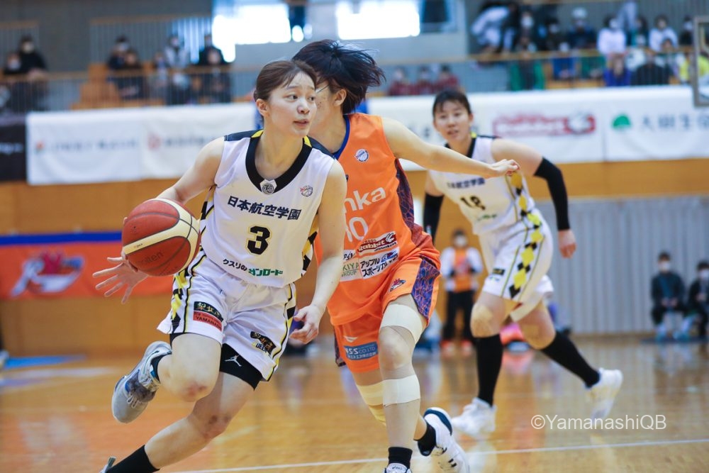 しかし、今日のクィーンビーズは昨日の課題として残ったボールが外で周る重いオフェンスを打破するため、土田・濱西が果敢にドライブ。