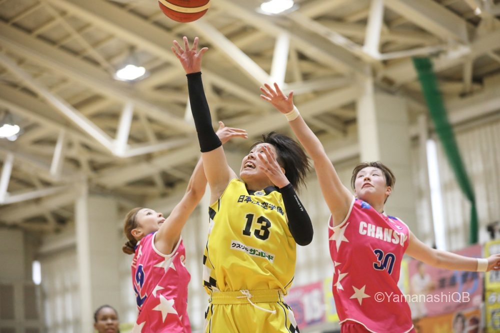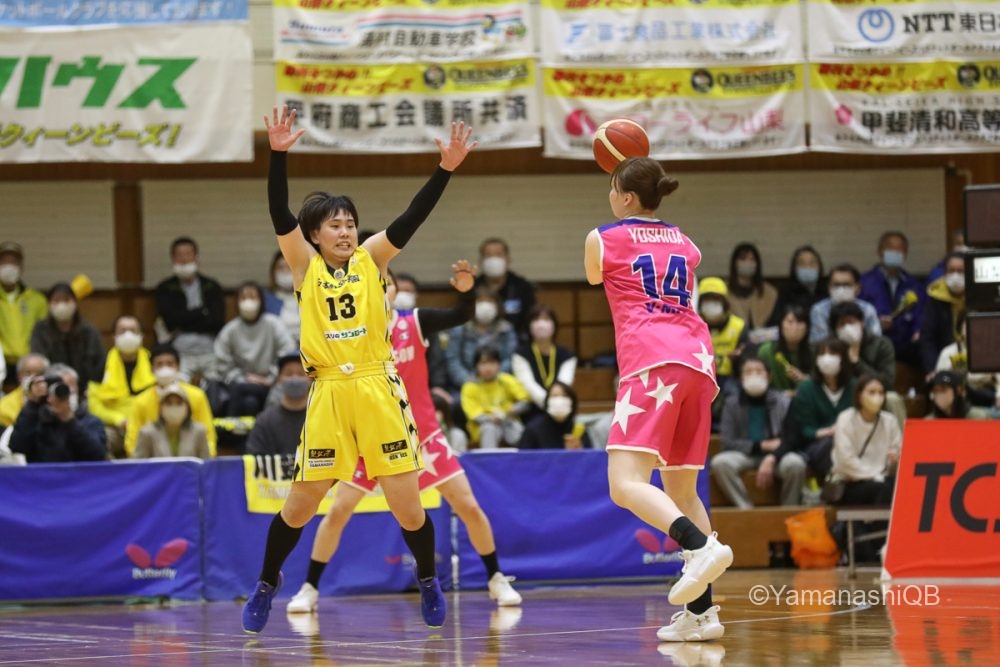 攻め切れないクィーンビーズに対し、シャンソンは強みであるインサイドを起点に吉田舞衣のスリー3本と内外でバランス良く得点し残り15点差をつけると11-26で1ピリを終了。