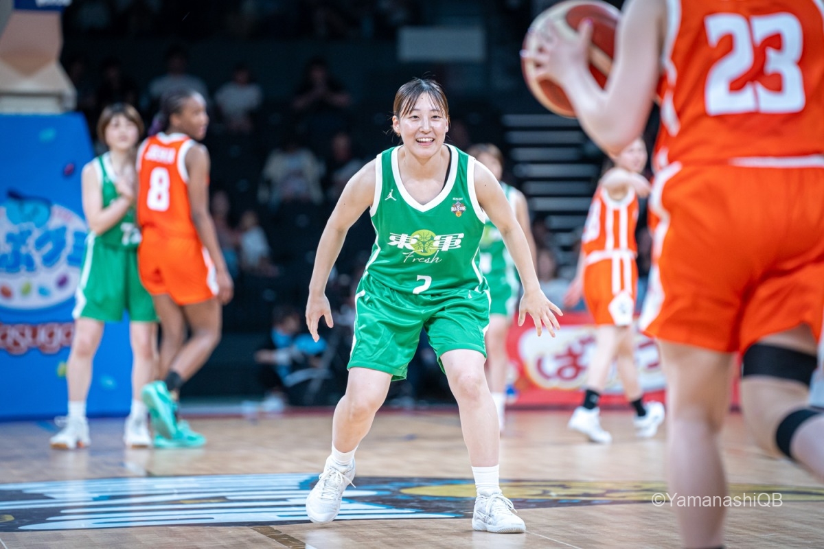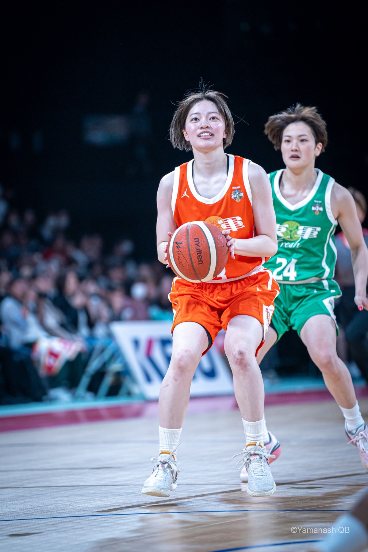 そして本日(4日)は、本戦が行われ、濱西七海がクィーンビーズの一員としてコートに立った。白熱した試合は、濱西選手所属の東軍が4Pに逆転し、103対98で勝利した。