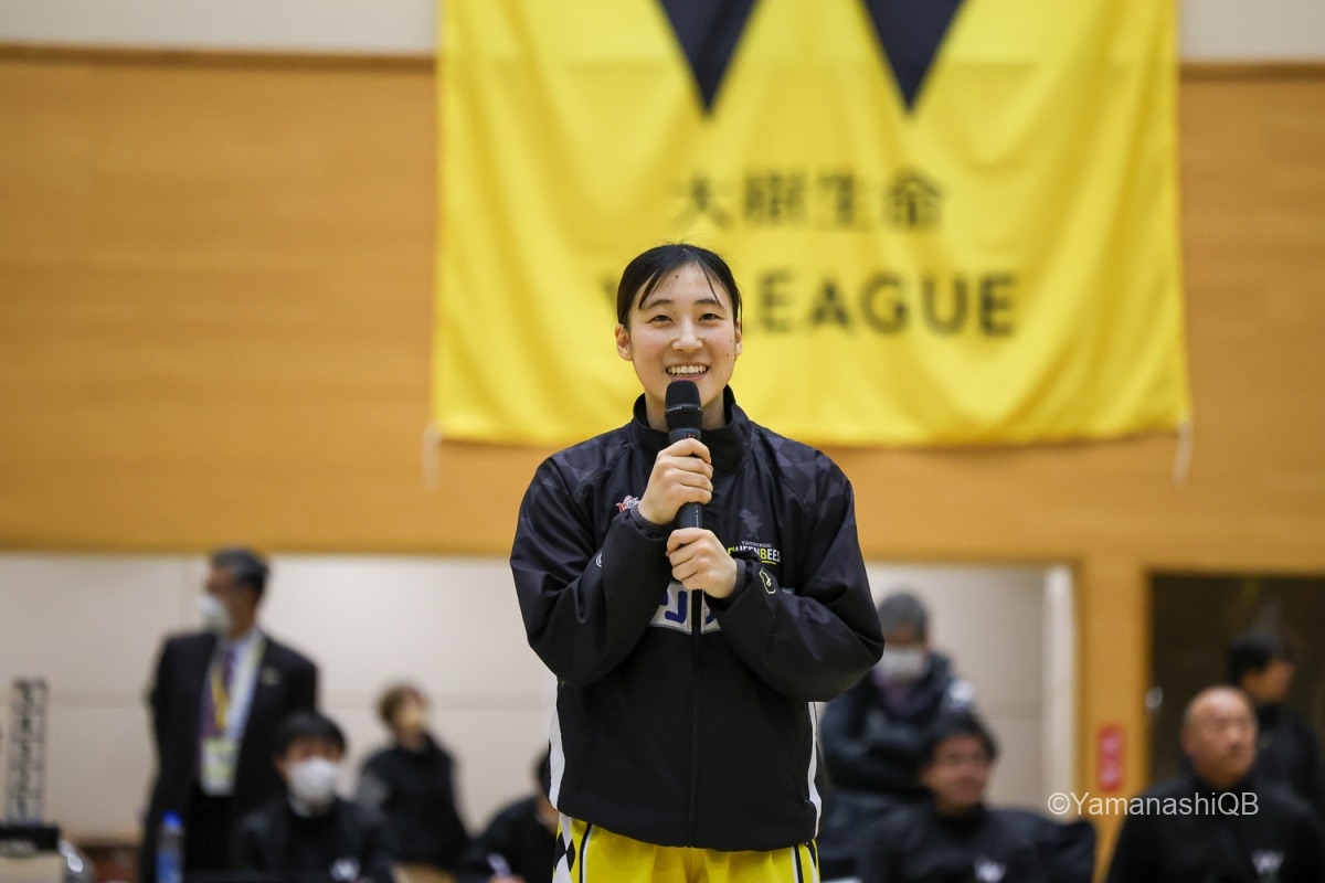 自身の激しいディフェンスからオフェンスの速い展開で得点機を演出した池田沙紀は、試合後のエンディングマイクでこう語った。
