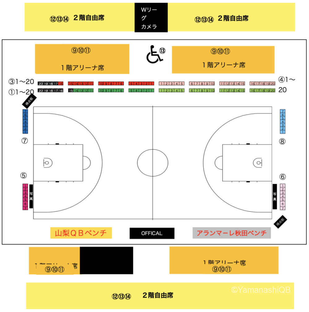 ※山梨QBベンチ側 アリーナ自由席の黒色部分に関しましては、冠スポンサー企業様エリアとなるため、お座りいただくことができかねますのでご了承ください。