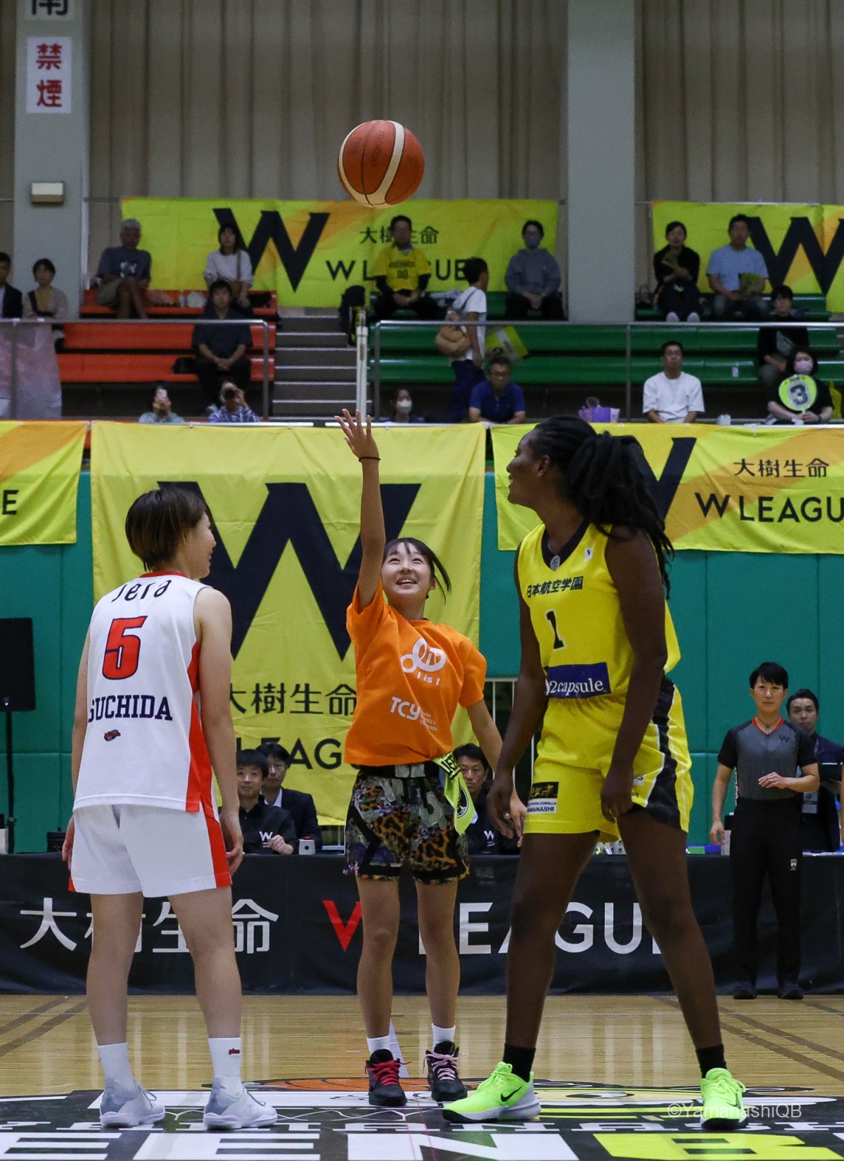 第1クォーター、先制したのはクィーンビーズ。片山菜々のスリーポイントが決まると、会場が沸く。しかしアランマーレも内藤や高橋のシュートで応戦し、一進一退の展開に。中盤には出原、井上がリングに積極的にアタックするが、アランマーレ秋田も着実に得点を重ね、第1Qは15–18とリードを許して終える。