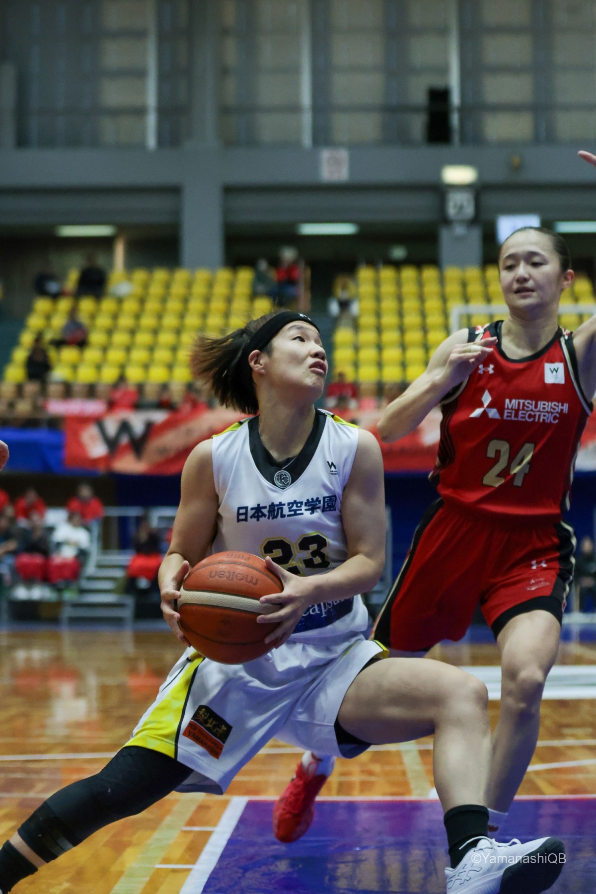 後半、三菱電機は中村のスリーポイントで反撃を開始。だが、渡邊愛加が即座にスリーで応戦。