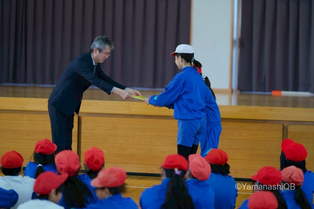 続いて、株式会社はくばく様より田富北小学校様へ、山梨クィーンビーズのホームゲーム観戦チケットを贈呈いただきました。
