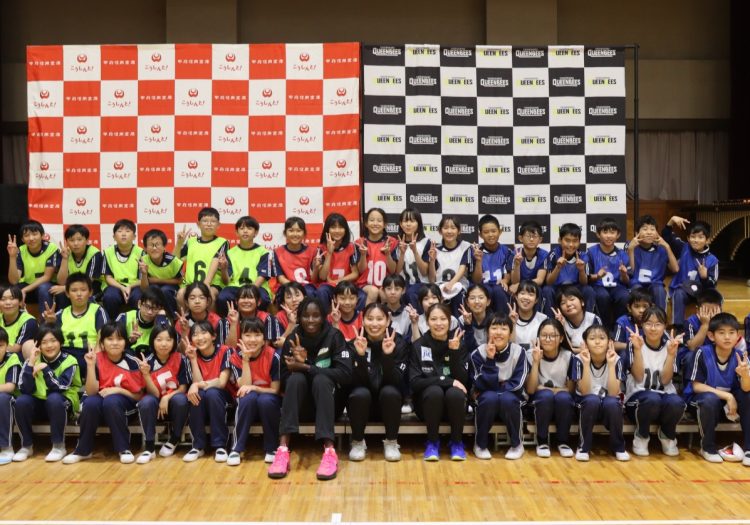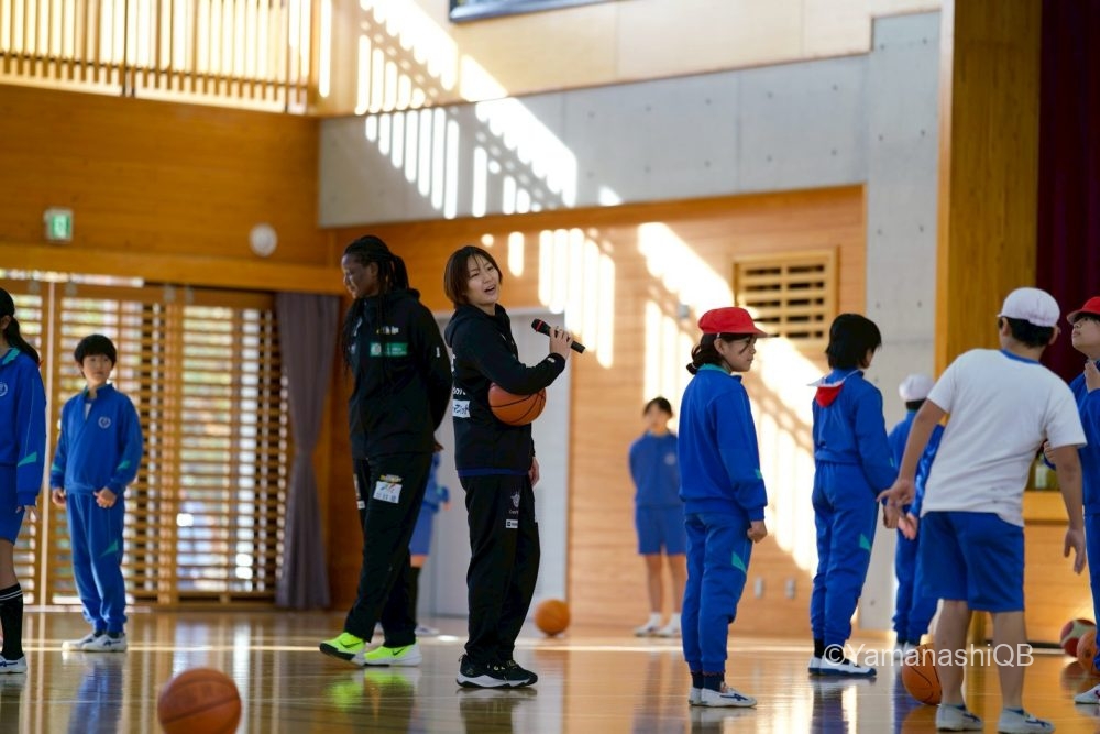 講演が終わると、会場の雰囲気を一変し、上長美菜選手を中心にバスケットボールクリニックを開催しました。選手たちは、パスやドリブルの基本的な動作をユーモアを交えながら指導し、子どもたちは身体を動かしながらバスケットボールの楽しさを体感しました。選手と児童が一体となって汗を流し、会場は笑顔で溢れました。