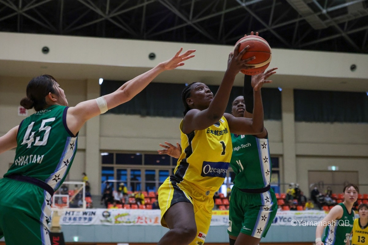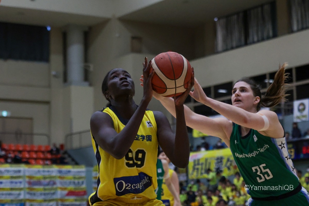 第1クォーター、クィーンビーズは高田栞里のスリーポイント、ダラーメ マレム ドイのポストプレーで一度はリードを奪った。しかし、ここから日立ハイテクの高さが試合の流れを変えた。