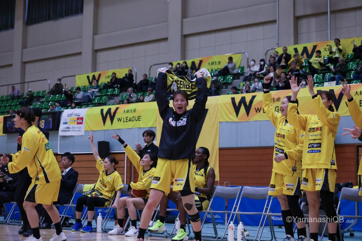 熊倉・前田の得点でSMBCが抵抗するも、上長美菜のスリーが流れを引き戻し、池田沙紀・ハディが加点して82-58。点差は最大24点に広がった。