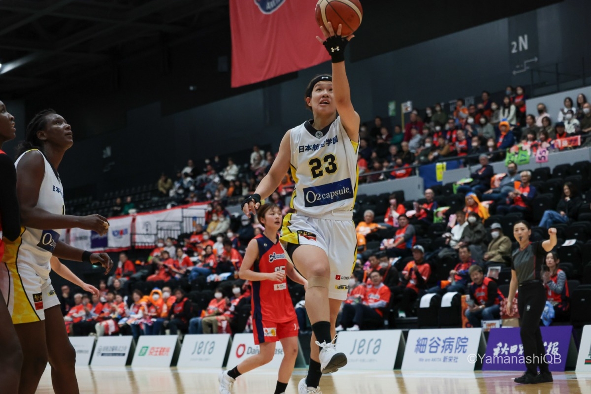 第4クォーターは池田沙紀、片山の連続得点でスタートし、52−38と一気に突き放す。