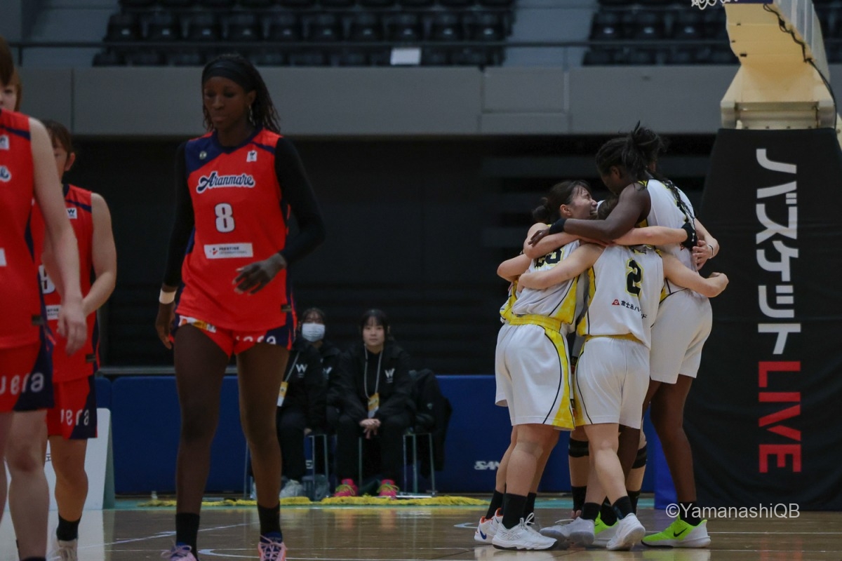 しかしアランマーレも反撃し、速攻を許す場面が続いて24−16と点差が縮まる。石川幸子ヘッドコーチが残り6分5秒でタイムアウト。直後に片山菜々が3ポイントを沈め、嫌な流れを断ち切る。