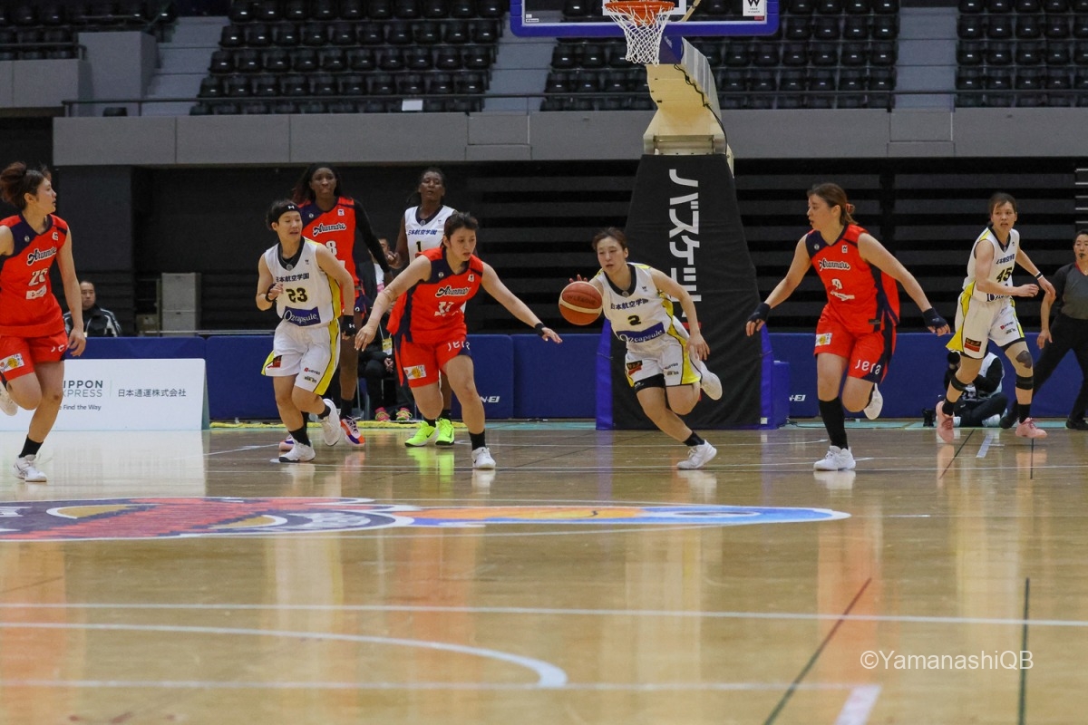 守備では坂田侑紀奈が積極的に仕掛けてマイボールにし、続いて高田栞里がダフェ・ハディのシュートがこぼれたところを押し込んで16−8とリードを広げた。アランマーレのタイムアウトを挟んでも集中は途切れず、18−10で最初の10分間を終えた。