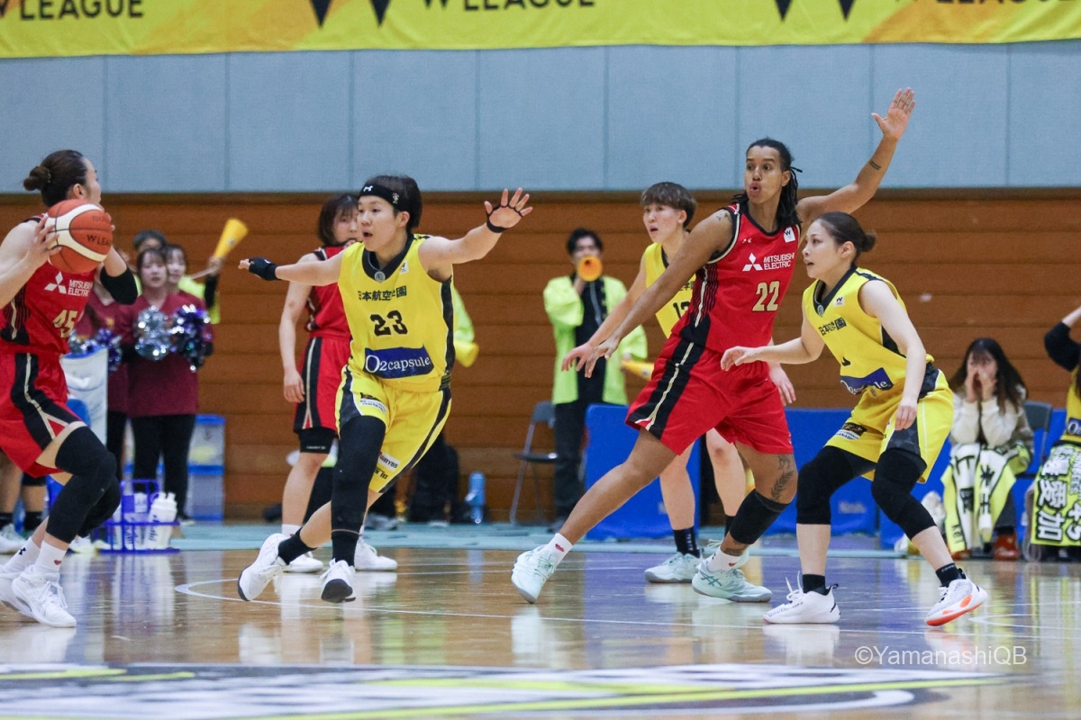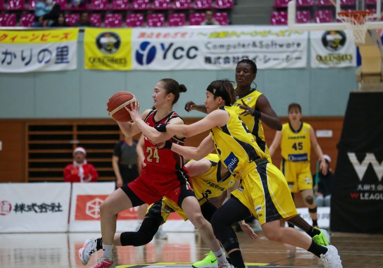 この試合の勝敗を分けたのは、クィーンビーズの持ち味であるディフェンスとリバウンド。ハードなディフェンスで三菱電機のターンオーバーを誘発しながらも、前半は「2点取っても3点を返される」展開に苦しみ、点差を詰めきれなかった。