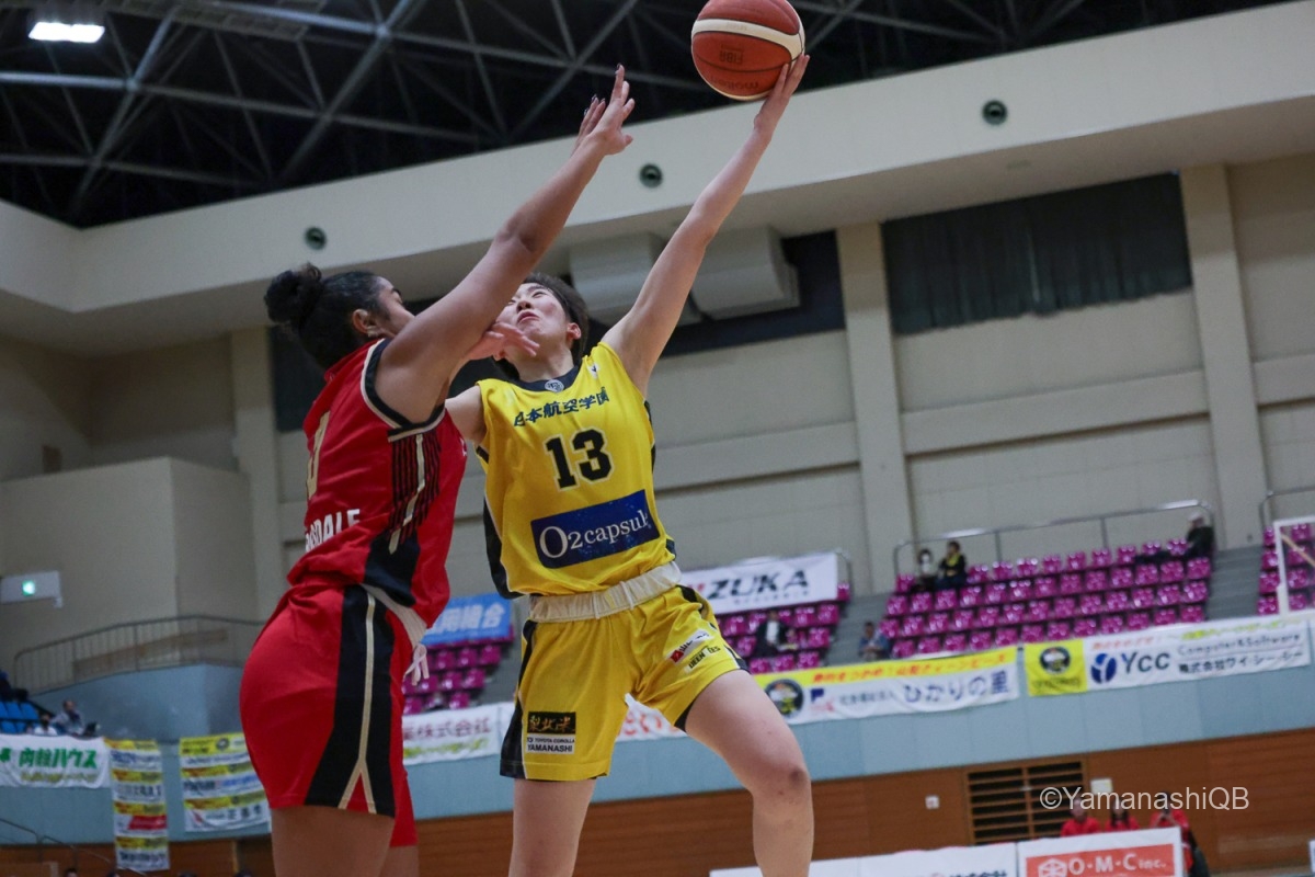 しかし、第1クォーター中盤以降は三菱電機がアウトサイドで優位に立つ。大崎の3Pを皮切りに外角シュートが高確率で決まり、このクォーターの三菱電機は3P成功率75%で9得点を記録した。一方、クィーンビーズは3Pを一本も決めることができず、得点はフリースローとインサイドに限定される。それでも積極的なディフェンスでターンオーバーを誘発し、食らいつく姿勢は崩さなかったが、13-20と7点ビハインドで第1クォーターを終えた。