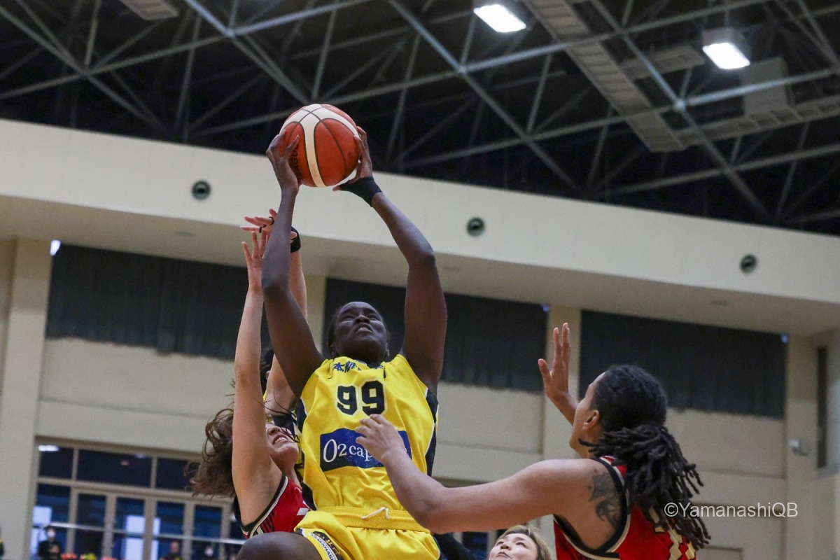 前半を通じて、クィーンビーズは12本のターンオーバーを奪いながらも、3P成功ゼロ。リバウンド数でも10-21と大きく後れを取る苦しい内容であった。