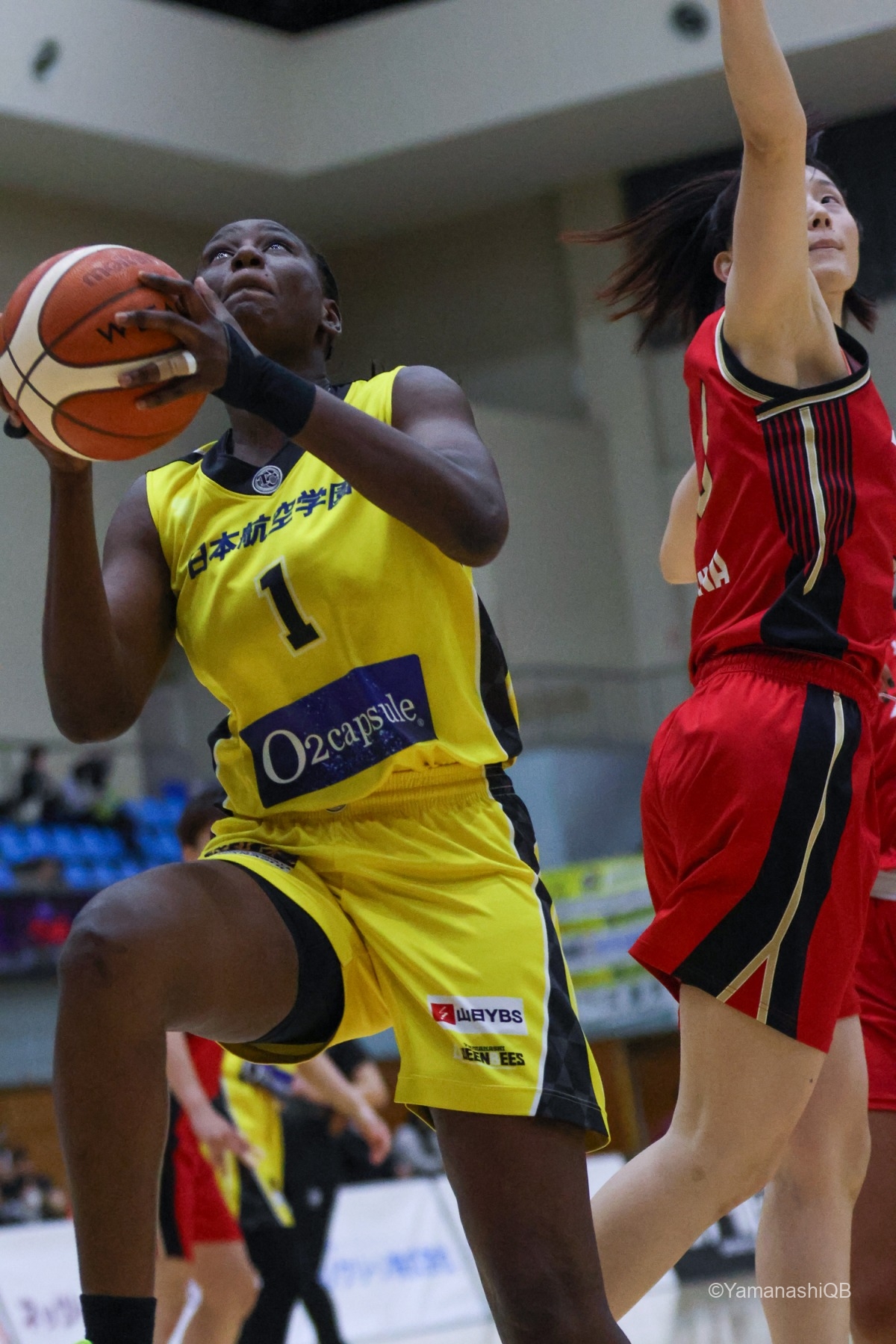 しかし、第1クォーター中盤以降は三菱電機がアウトサイドで優位に立つ。大崎の3Pを皮切りに外角シュートが高確率で決まり、このクォーターの三菱電機は3P成功率75%で9得点を記録した。一方、クィーンビーズは3Pを一本も決めることができず、得点はフリースローとインサイドに限定される。それでも積極的なディフェンスでターンオーバーを誘発し、食らいつく姿勢は崩さなかったが、13-20と7点ビハインドで第1クォーターを終えた。
