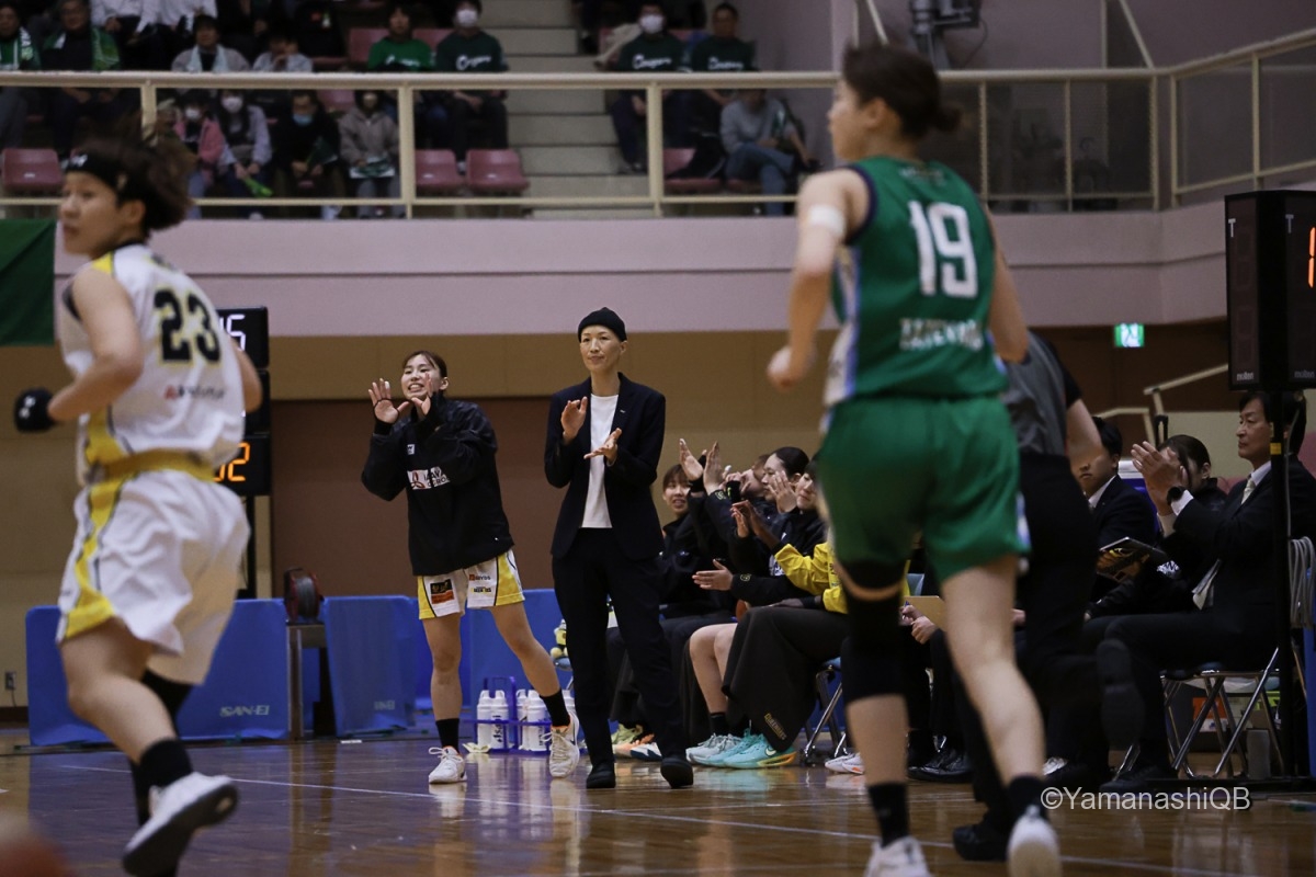 残り3分、クィーンビーズはゾーンディフェンスに切り替え、池田の3ポイントで40-40と再び同点に追いつく。しかし直後、オフェンスリバウンドから粟谷の3ポイント、中野の得点を許し一気に5失点。残り2分21秒、40-45でタイムアウトを取るが、さらに樋口に3ポイントを決められ、42-48。6点ビハインドで最終クォーターへ突入した。