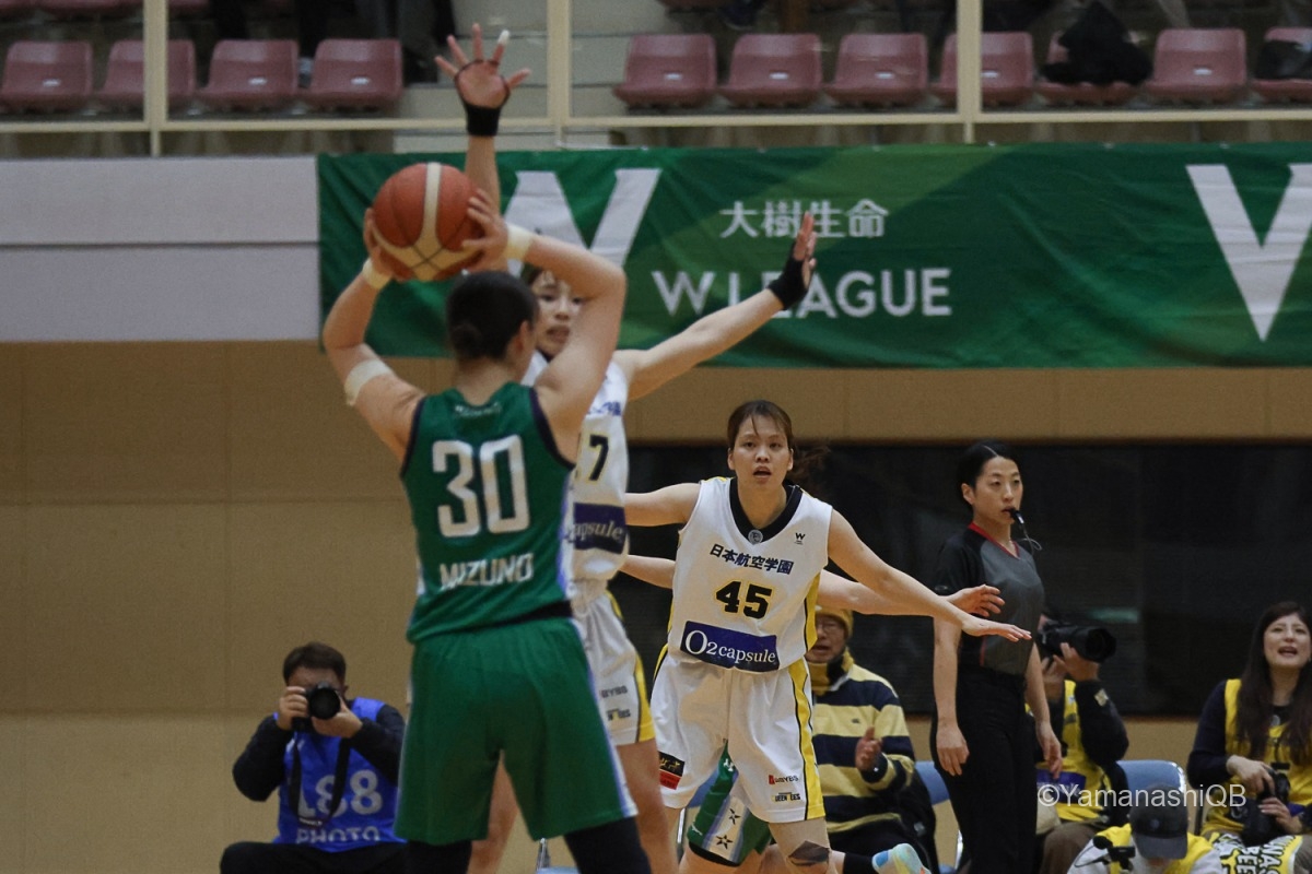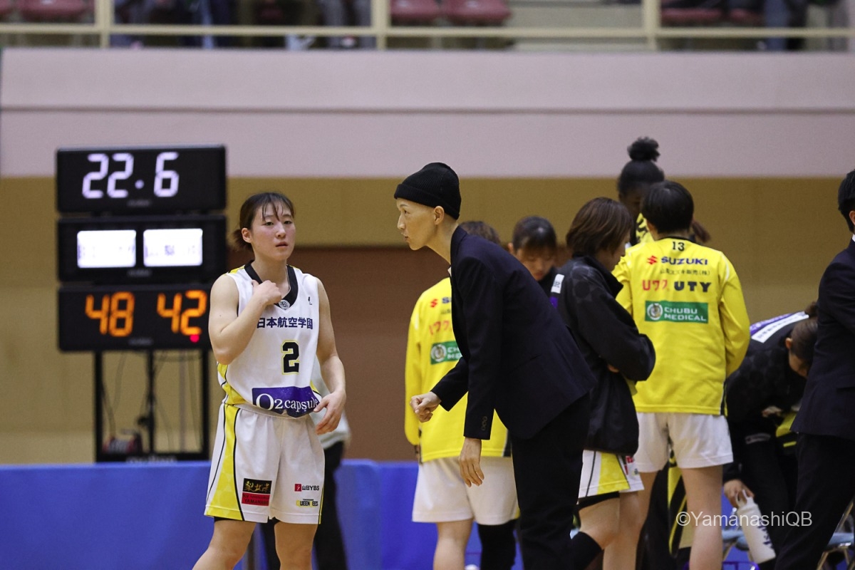 ここからダフェ・ハディ、坂田侑紀奈、上長美菜らセカンドユニットを投入し流れを引き戻すと、11-14、11-16と一時は点差を縮める。だが日立ハイテクの強烈なディフェンスプレッシャーの前にターンオーバーを重ね(1Qだけで4本)、その隙を突かれて速攻を許す。11-20。9点ビハインドで第1クォーターを終えた。