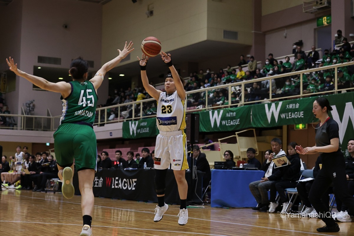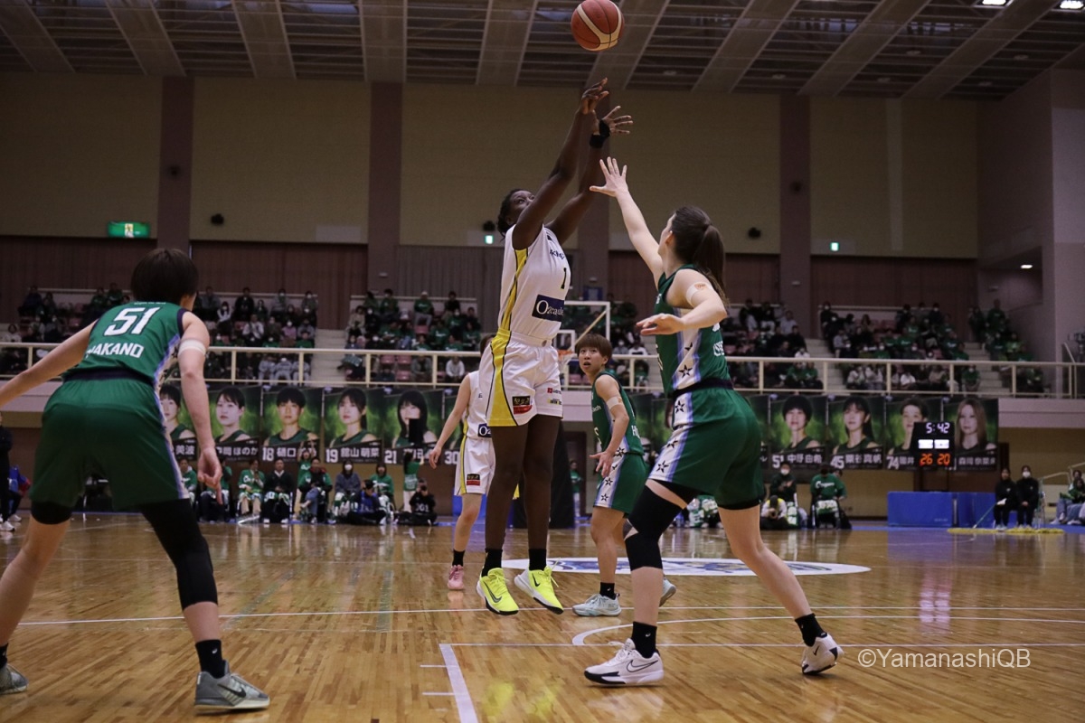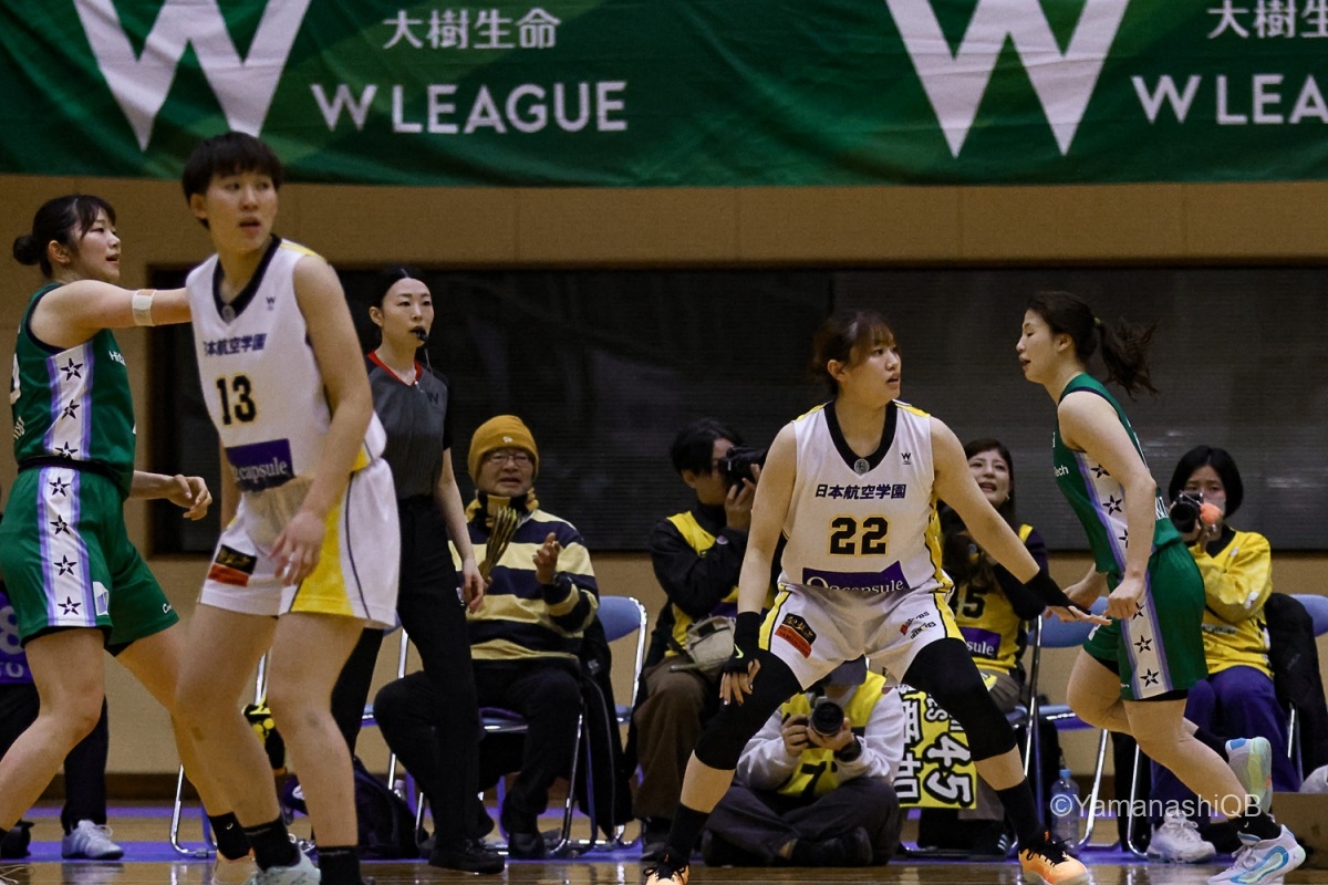 ここからダフェ・ハディ、坂田侑紀奈、上長美菜らセカンドユニットを投入し流れを引き戻すと、11-14、11-16と一時は点差を縮める。だが日立ハイテクの強烈なディフェンスプレッシャーの前にターンオーバーを重ね(1Qだけで4本)、その隙を突かれて速攻を許す。11-20。9点ビハインドで第1クォーターを終えた。