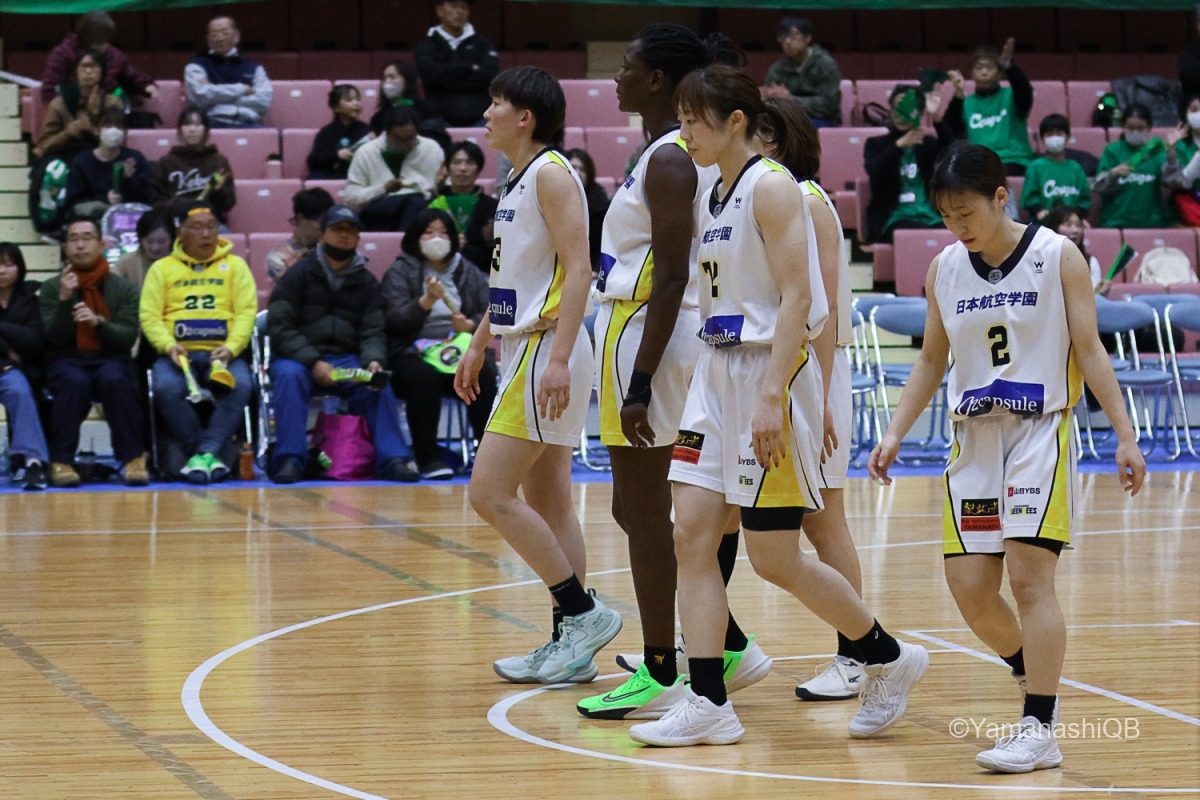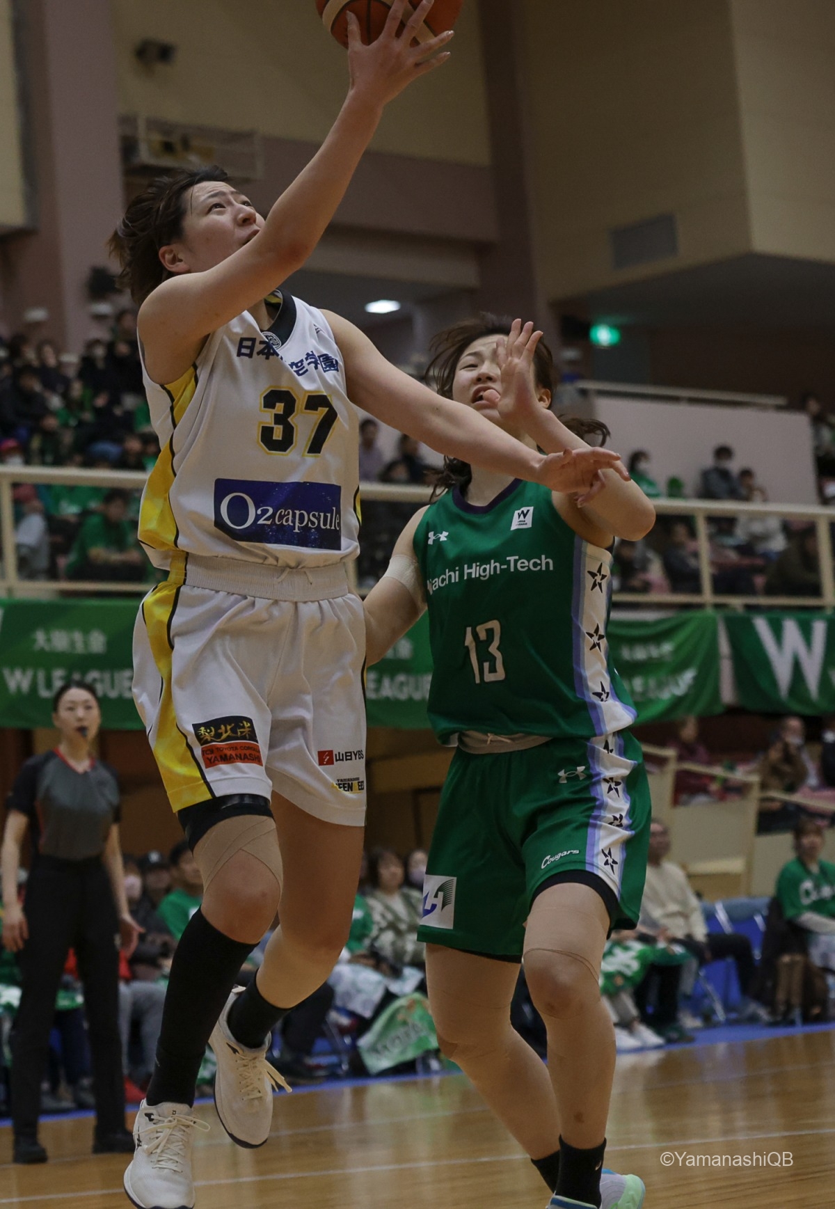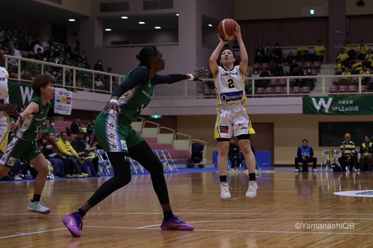 2点取れば3点を返される。波を引き寄せられない展開が続く。その焦りからかボールが手につかず、渡邊愛加や坂田のターンオーバーが続く。高田の3ポイントで流れは完全に日立ハイテクへ傾いた。