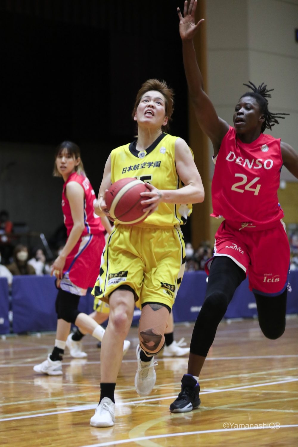 立ち上がりオフェンスもディフェンスも相手に勢いがあり、そこで点差が開いてしまった。2ピリからゾーンディフェンスを取り入れたら、それが効いてたので4Pの途中まで引っ張った。しかしオフェンスでデンソーの「ディナイでパスが出せない」そして「ドライブで切れない」と攻め手を見出せなかった。