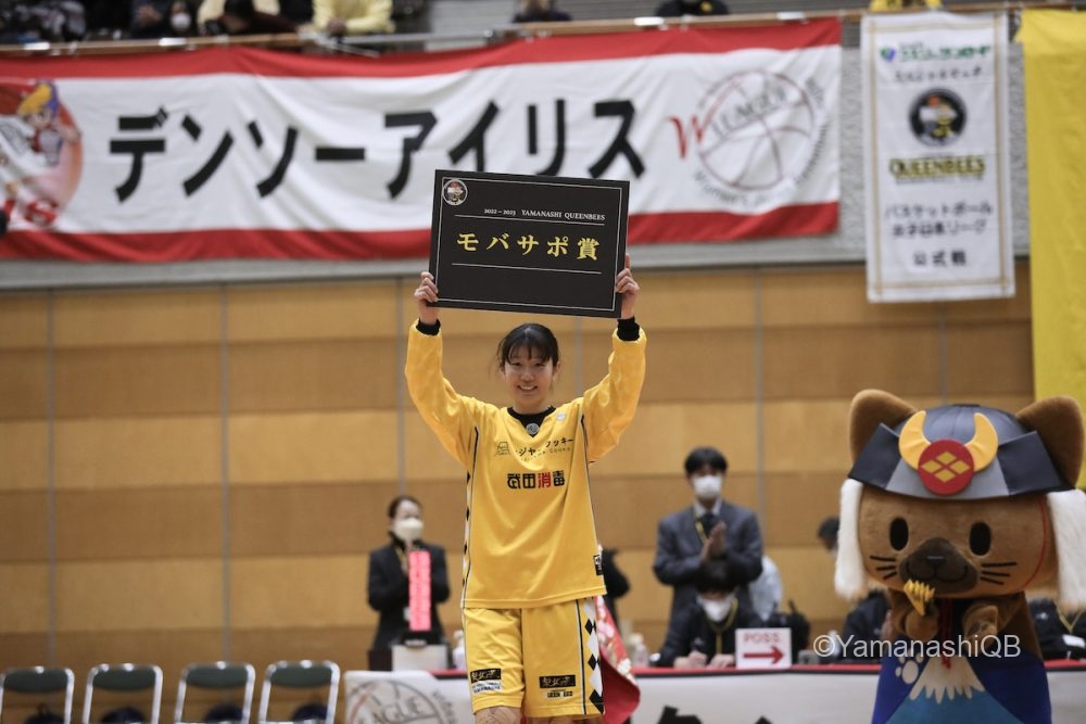 後半も3-2ゾーンでデンソーのオフェンスに対抗するものの、28-50と得点差は32点と開いて最終第4ピリオドへ。 クィーンビーズは、ゾーンプレスで攻撃的にデンソーのオフェンスで対抗すると「今日は意地です、チームの起爆剤になりたかった」と、昨日から思い通りのパフォーマンスが表現できなかった若原愛美がボールが回らなかったオフェンスでインサイドに基点を作り、飛ばしたパスで渡邊 愛加がスリーを沈めると、続いて濱西 七海もスリー。