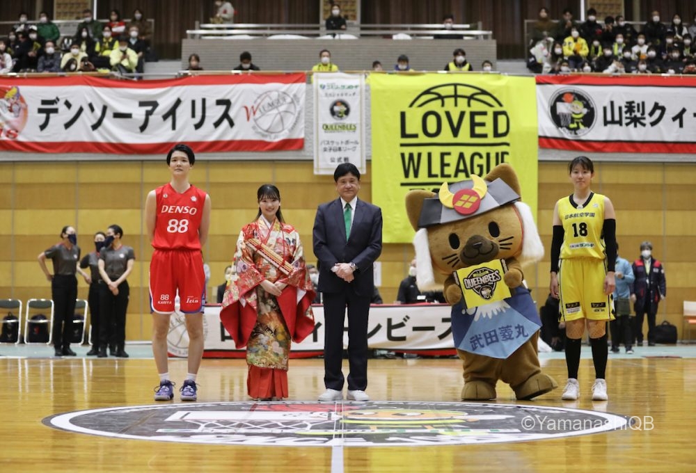 昨日に続いてのデンソー戦 会場の甲府市民総合会館「山の都アリーナ」には今日も、約700名のファン・ブースターが詰めかけクィーンビーズに後押し。開催地の樋口 雄一甲府市長の両チームへの激励の言葉・ティップオフセレモニーの後、第1ピリオドがスタート。